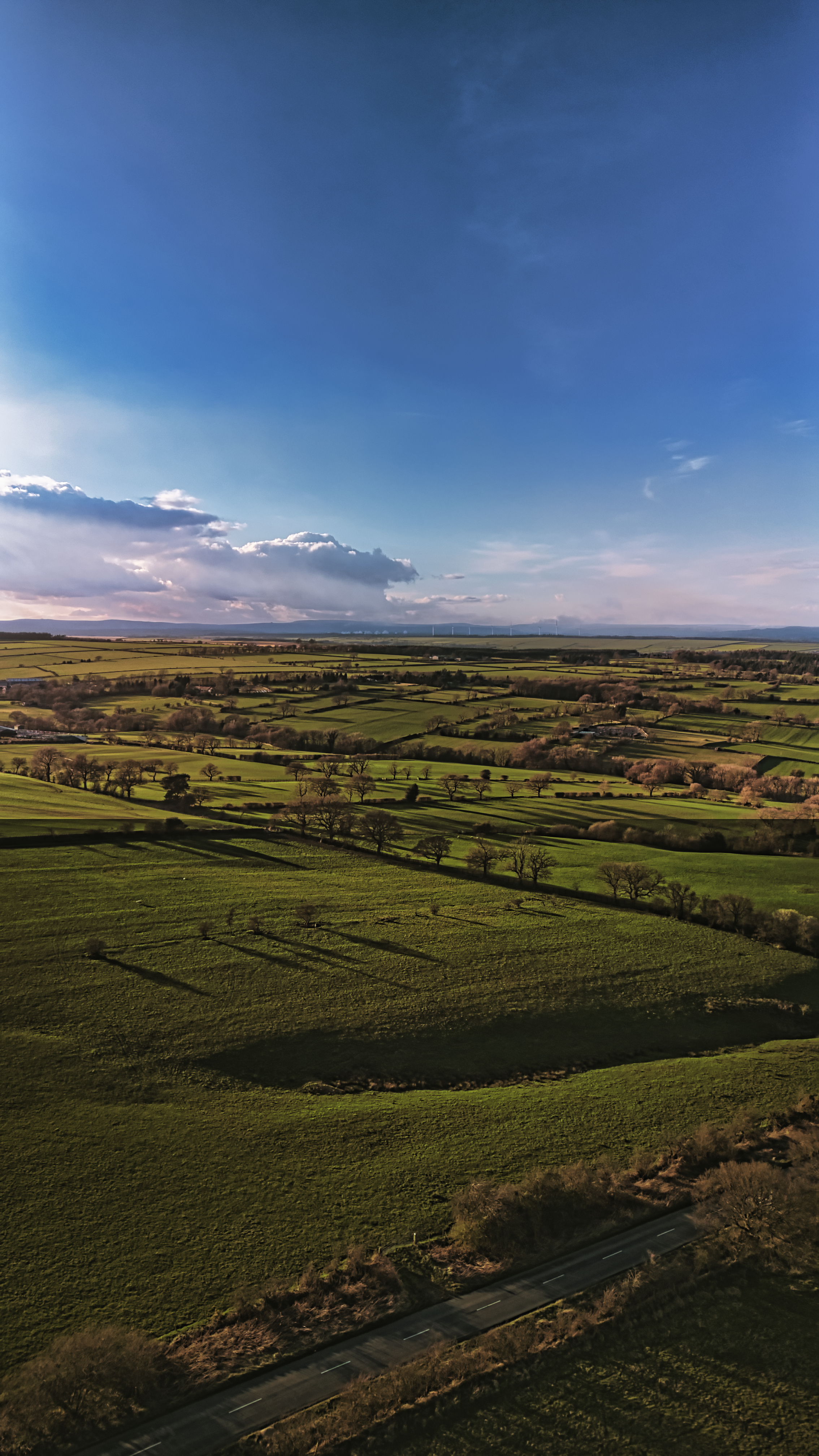 Scenic aerial view of lush green fields under a dramatic sky at dusk, showcasing the beauty of rural landscapes in North Yorkshire.