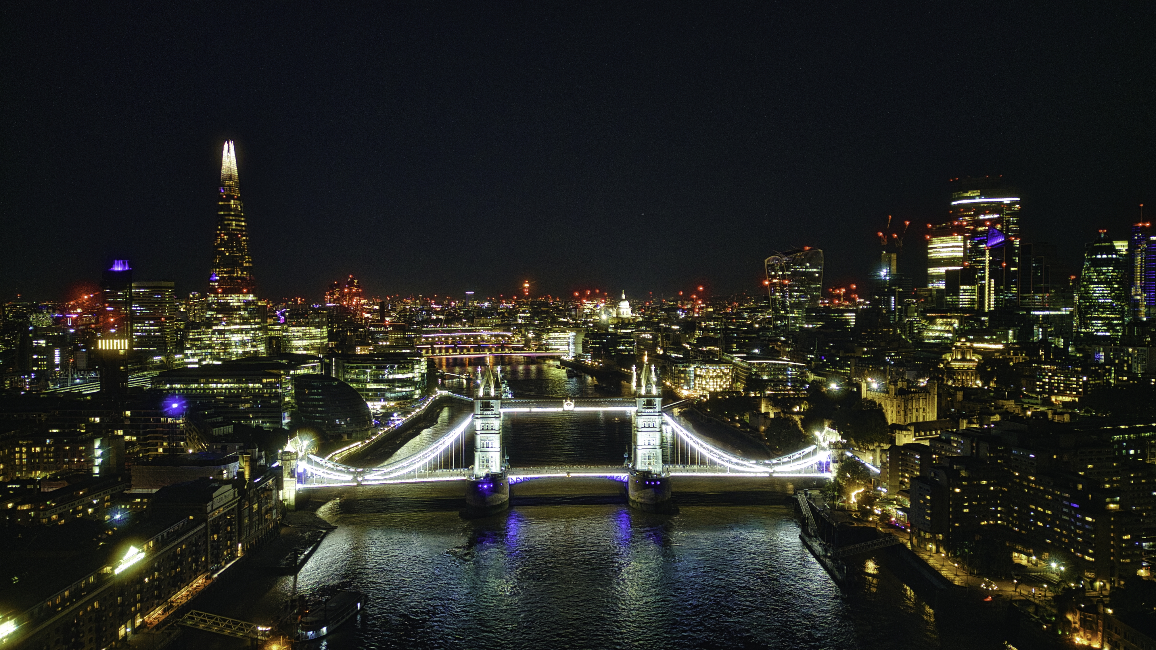 Scenic aerial view of the Tower Bridge and city at night in London