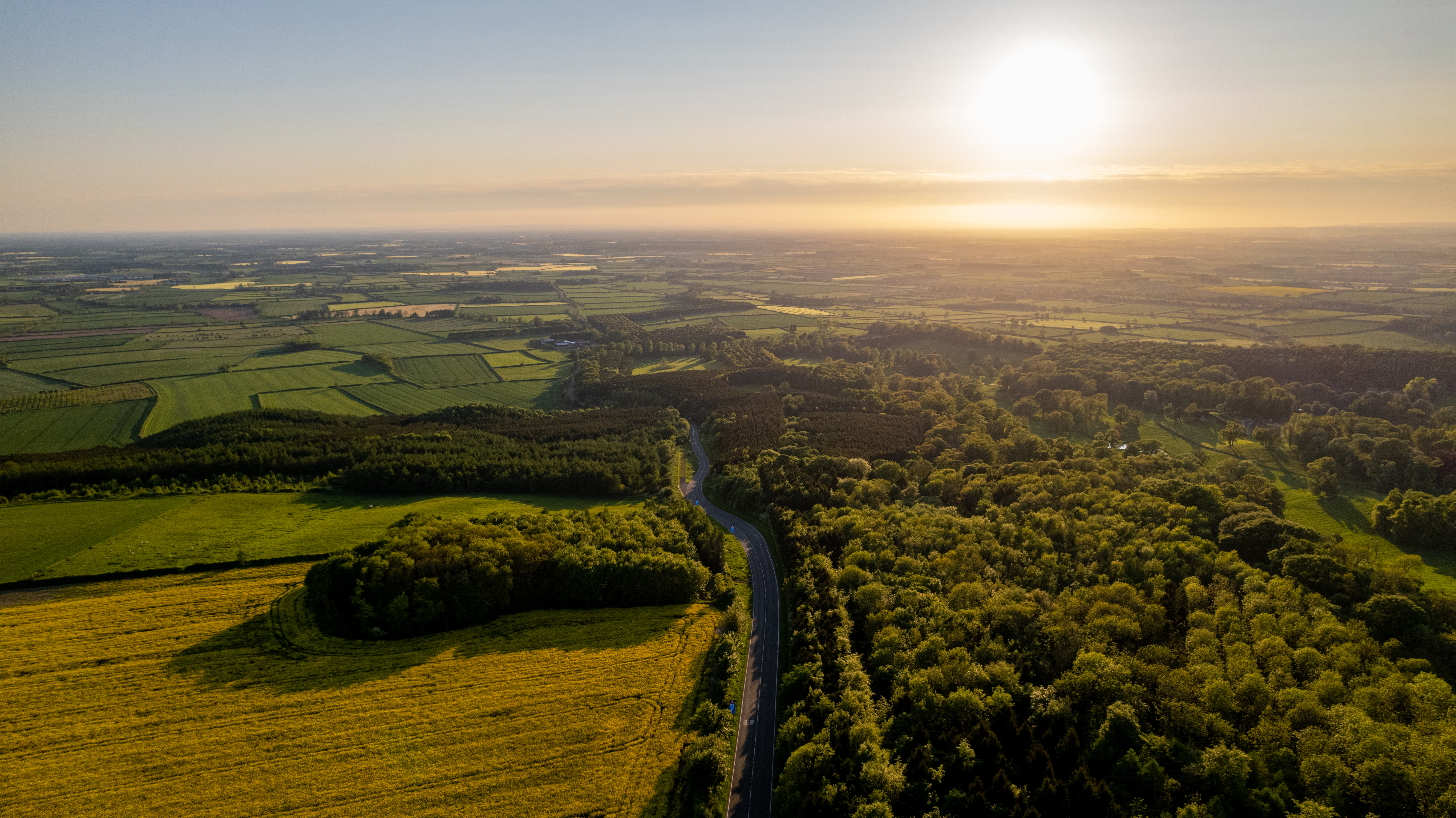 Scenic aerial view of the sunset above the forest in Yorkshire