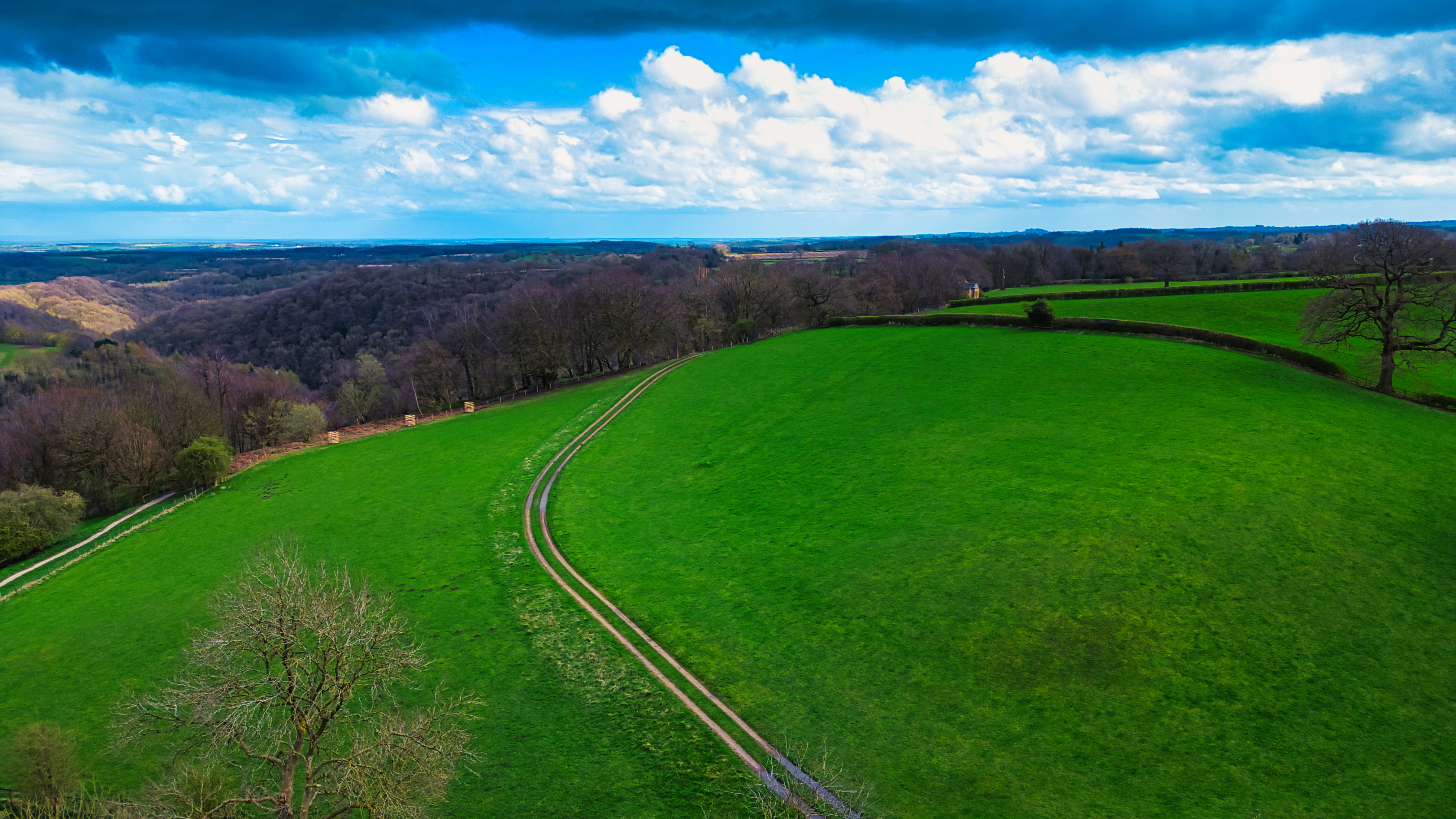 Scenic countryside landscape with lush green fields, a winding path, and a vibrant blue sky with scattered clouds. Ideal for backgrounds and nature themes.