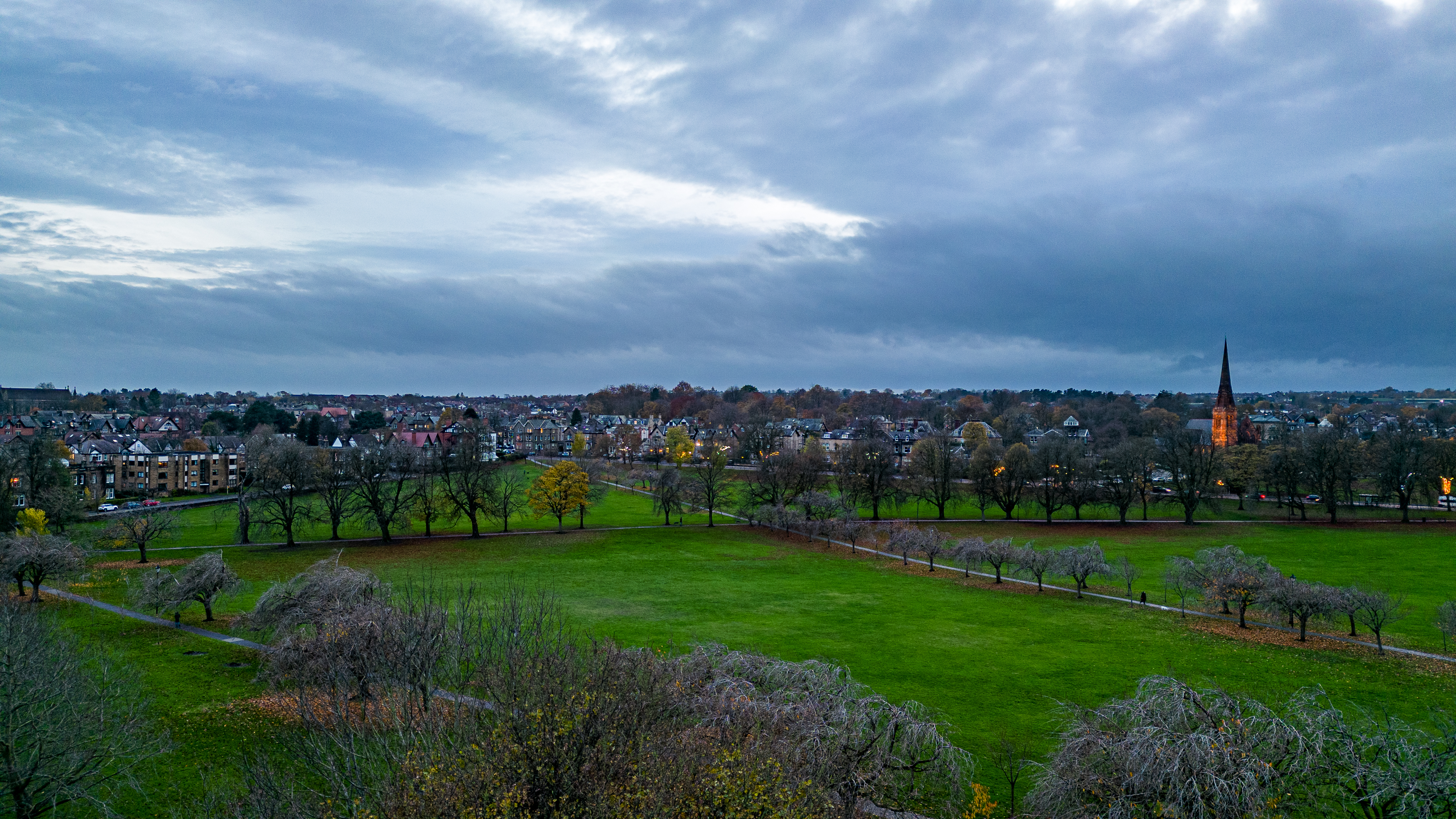 Scenic view of a lush green park with a city skyline under a dramatic cloudy sky at dusk in Harrogate, North Yorkshire.