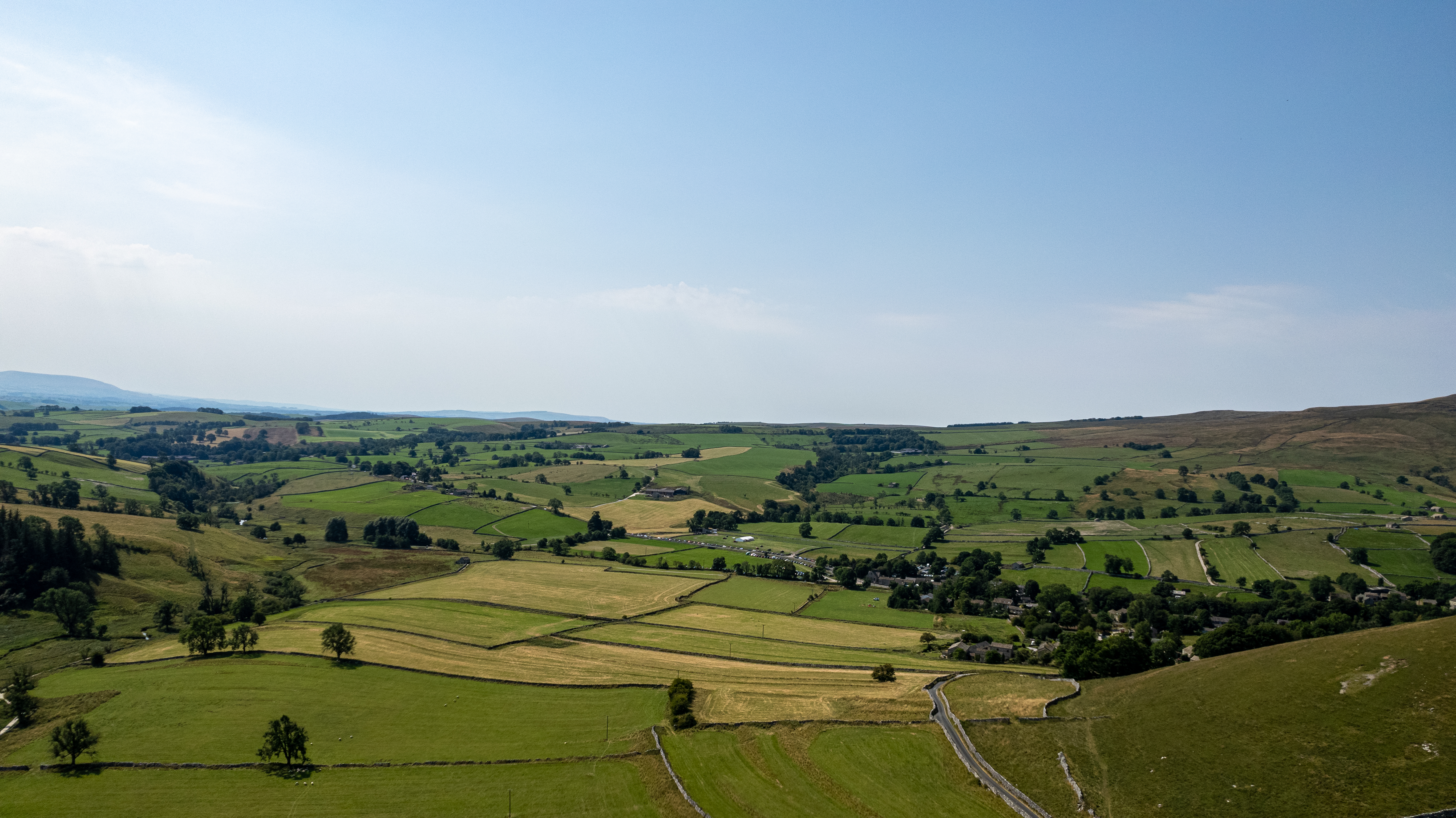 Scenic view of a lush green valley with patchwork fields and a clear sky, ideal for landscape and travel themes.