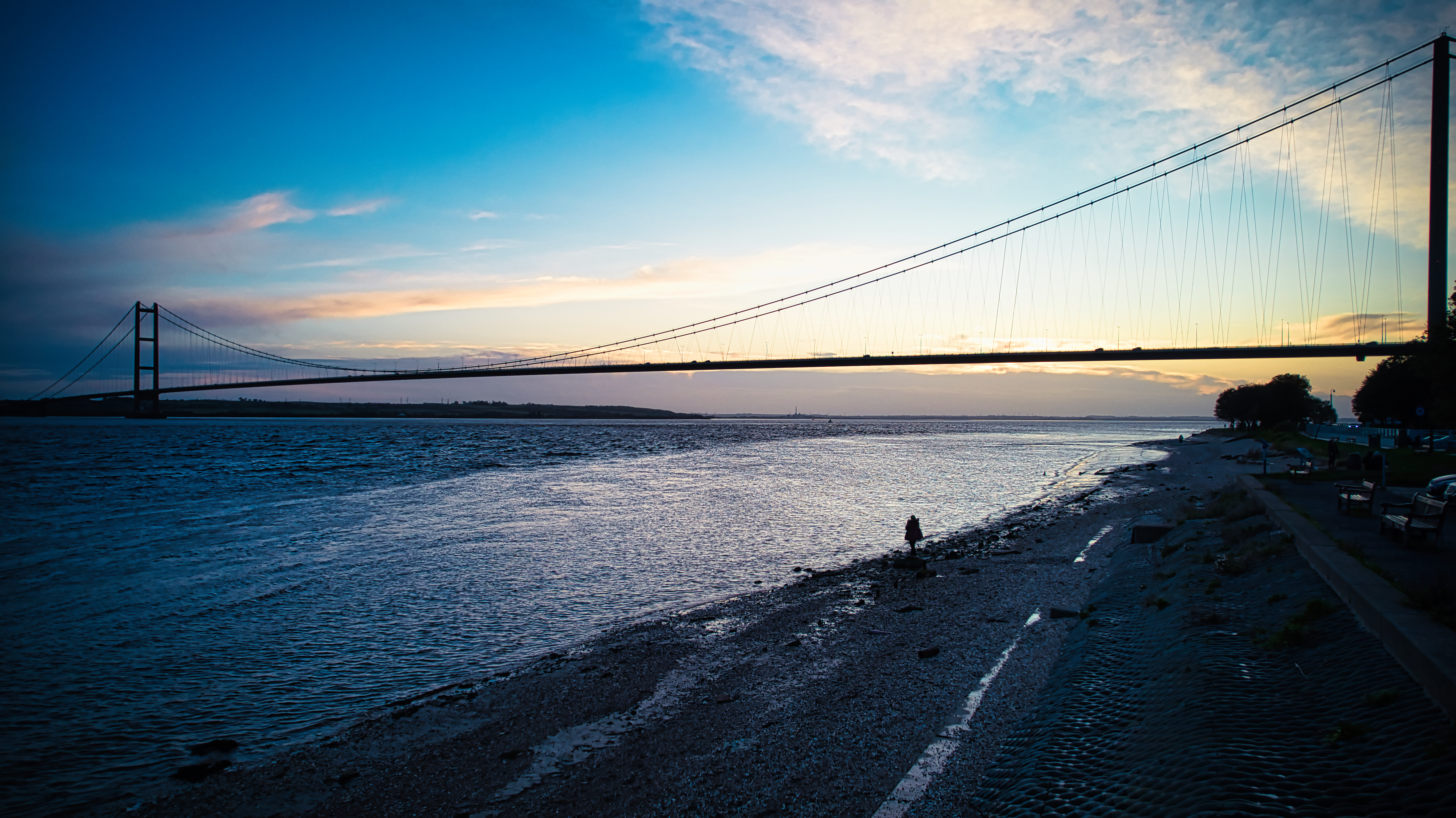 Scenic view of a suspension bridge over a tranquil river at dusk with silhouettes of people on the shore and a colorful sky in Hull, England.