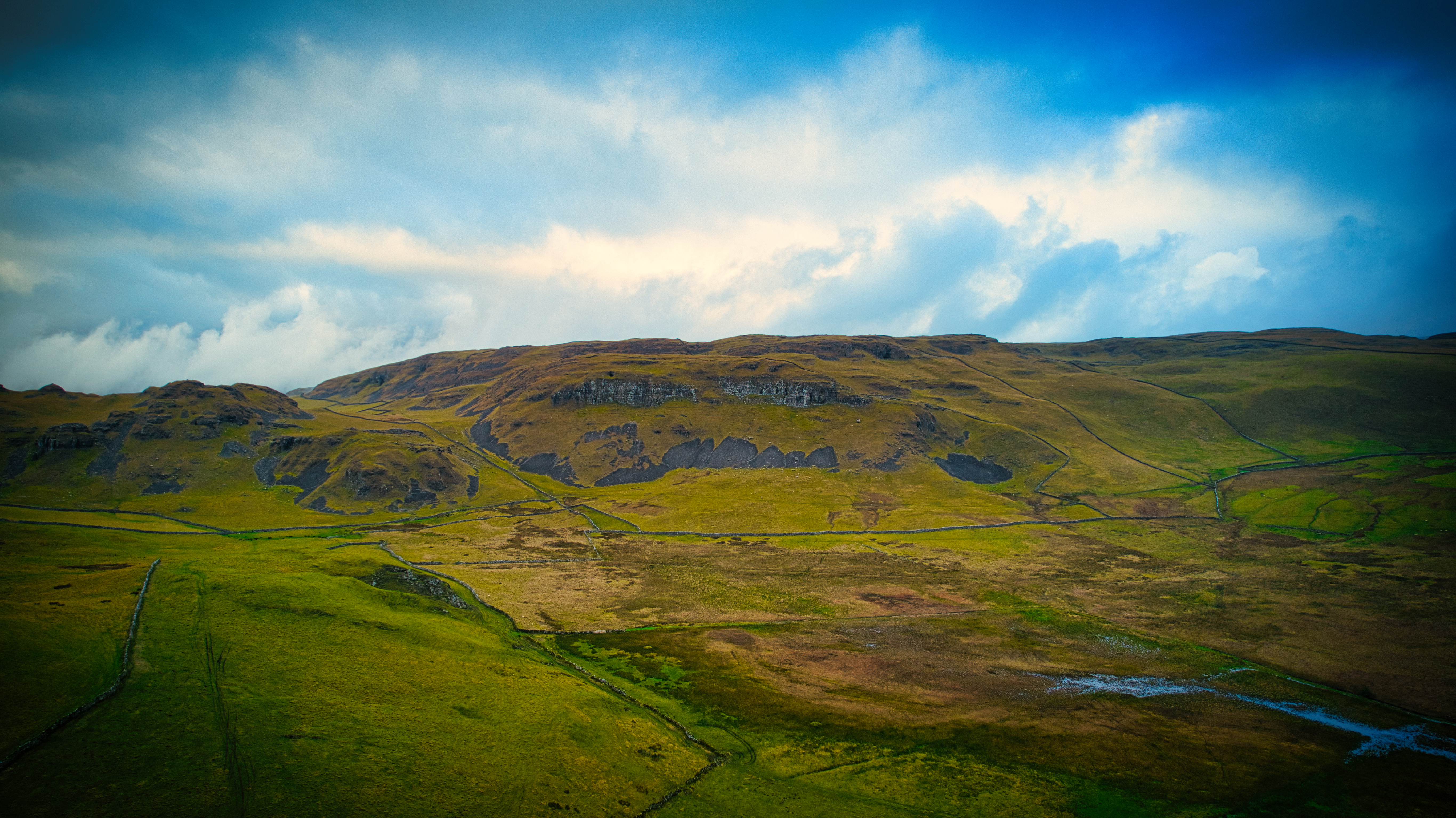 Scenic view of lush green fields leading up to a rugged mountain under a blue sky with clouds.