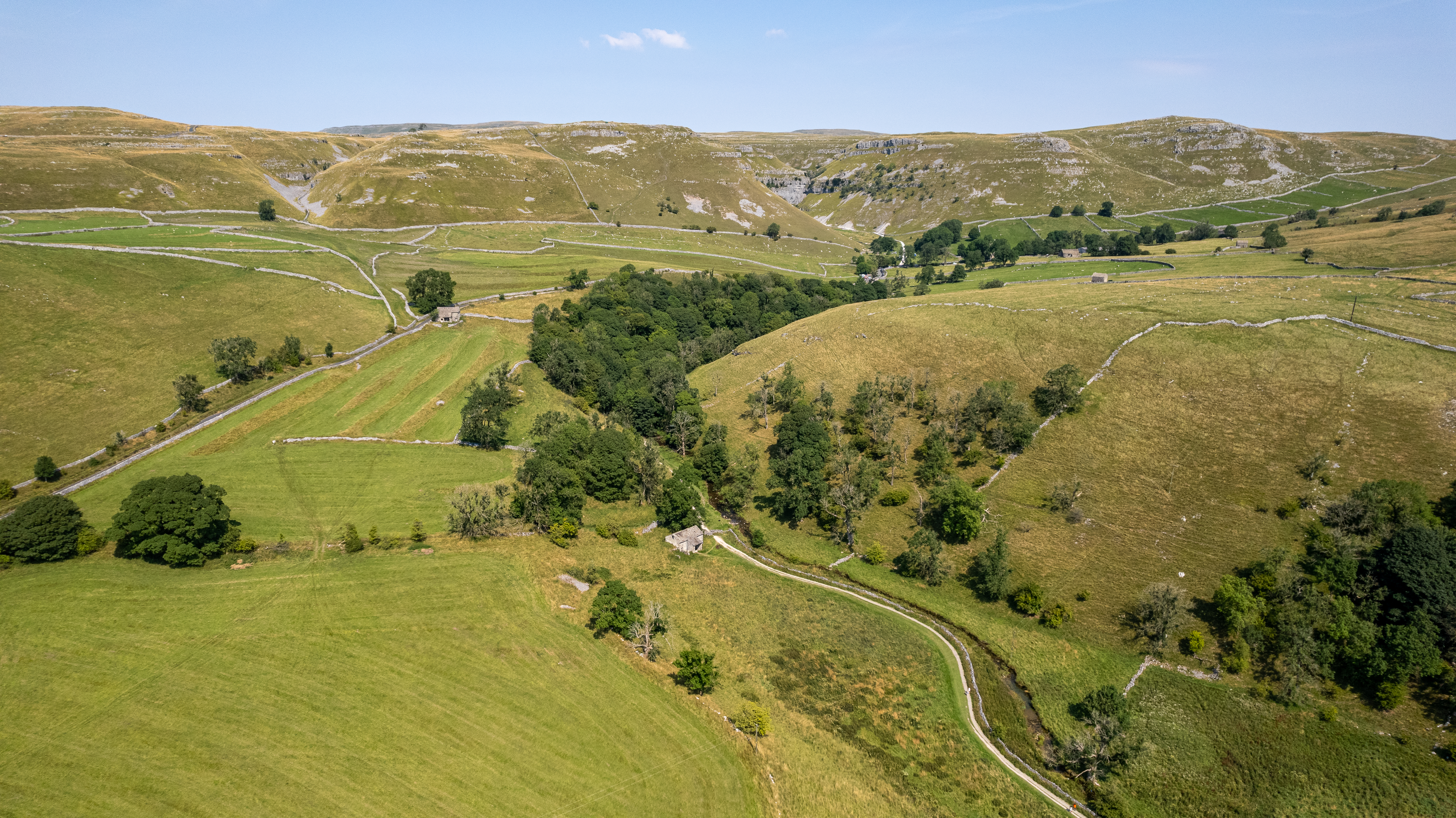 Scenic view of rolling hills with green fields and a country road, under a clear sky.