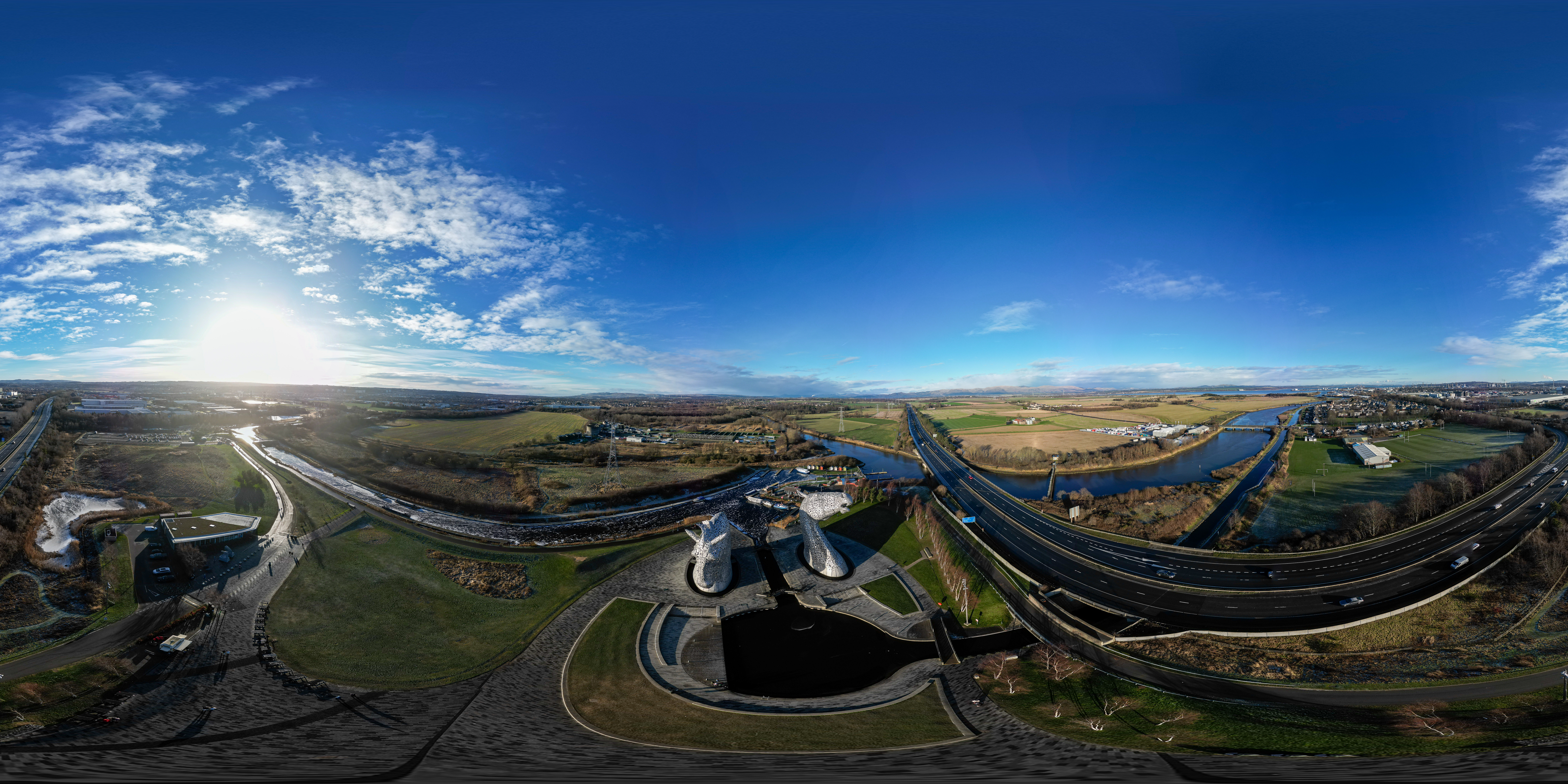 A panoramic aerial view of a modern sculpture park featuring large equine heads, a canal, a river, and a highway under a bright blue sky with scattered clouds.