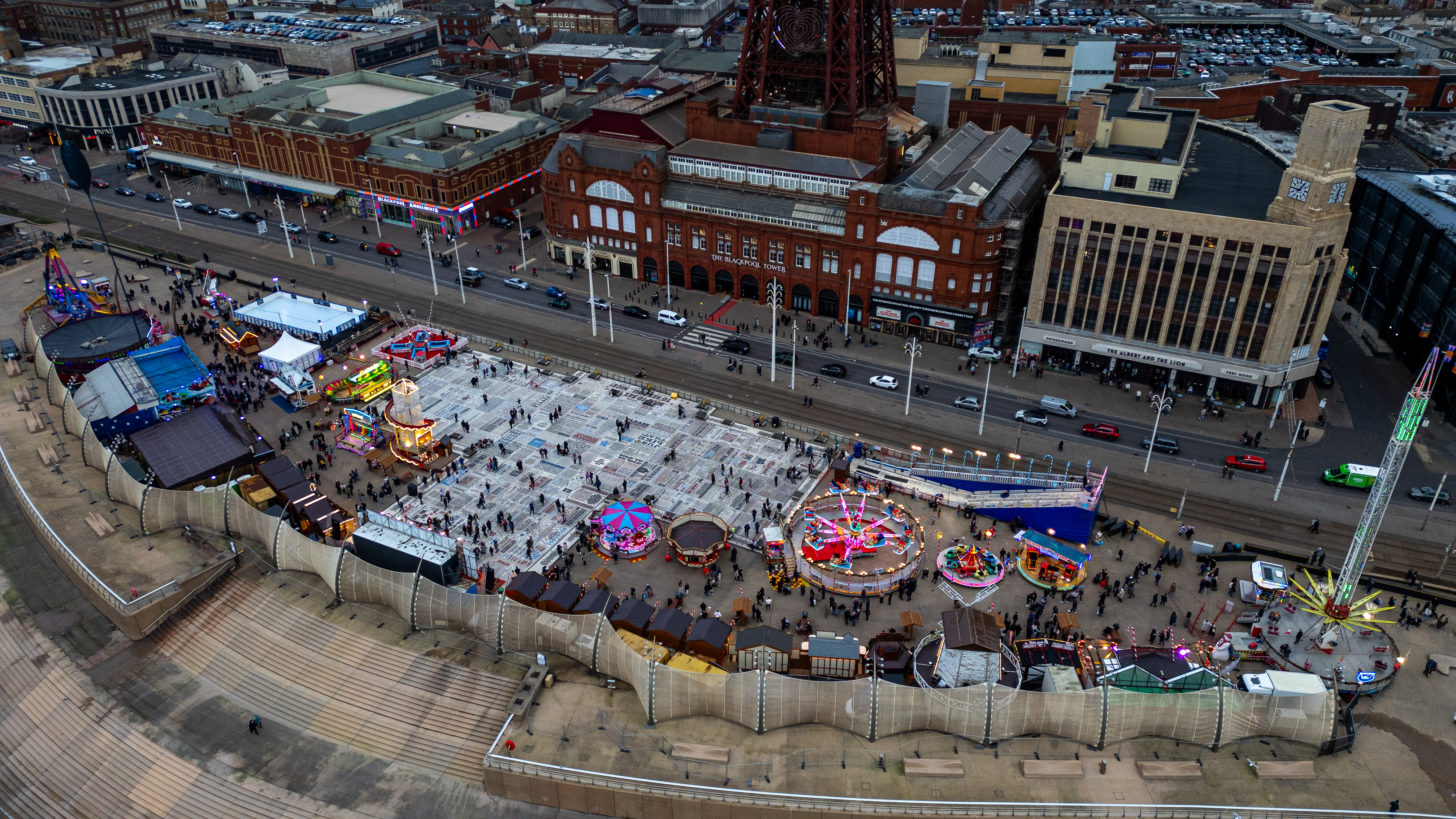 An aerial view of a lively seaside amusement area with rides, stalls, and people. The iconic Blackpool Tower is visible in the background.