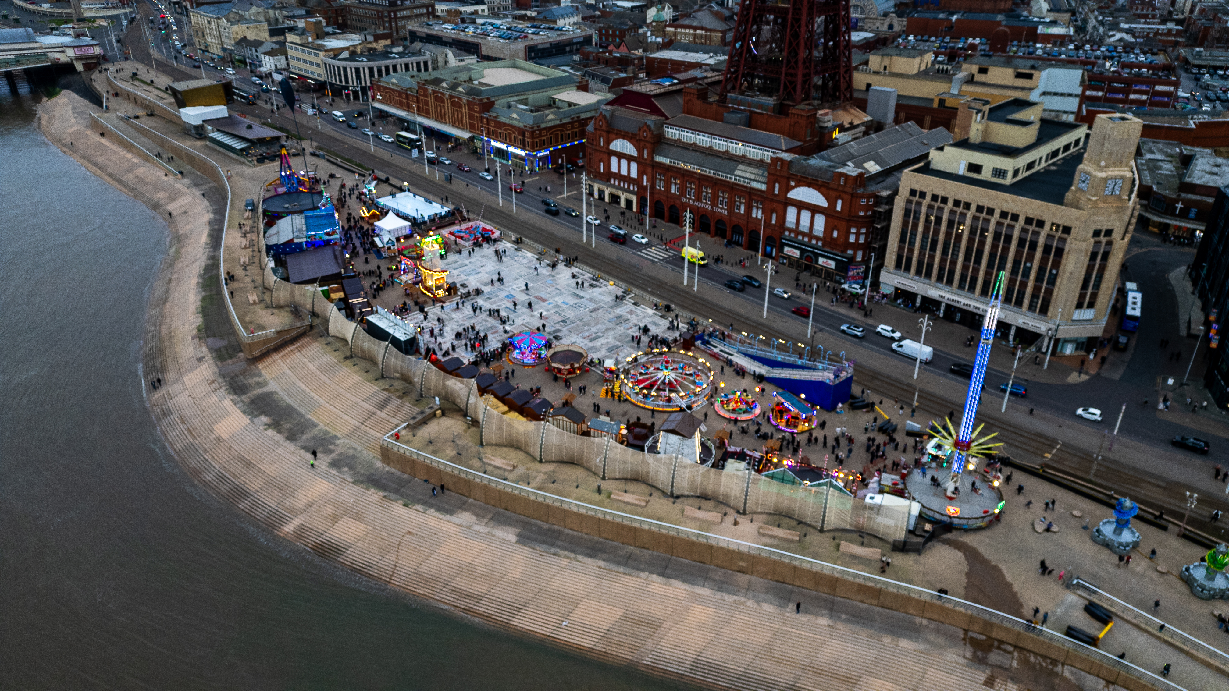 Aerial view of a seaside amusement park and boardwalk, featuring rides, stalls, and a large number of people, with buildings and a tower in the background in Blackpool.