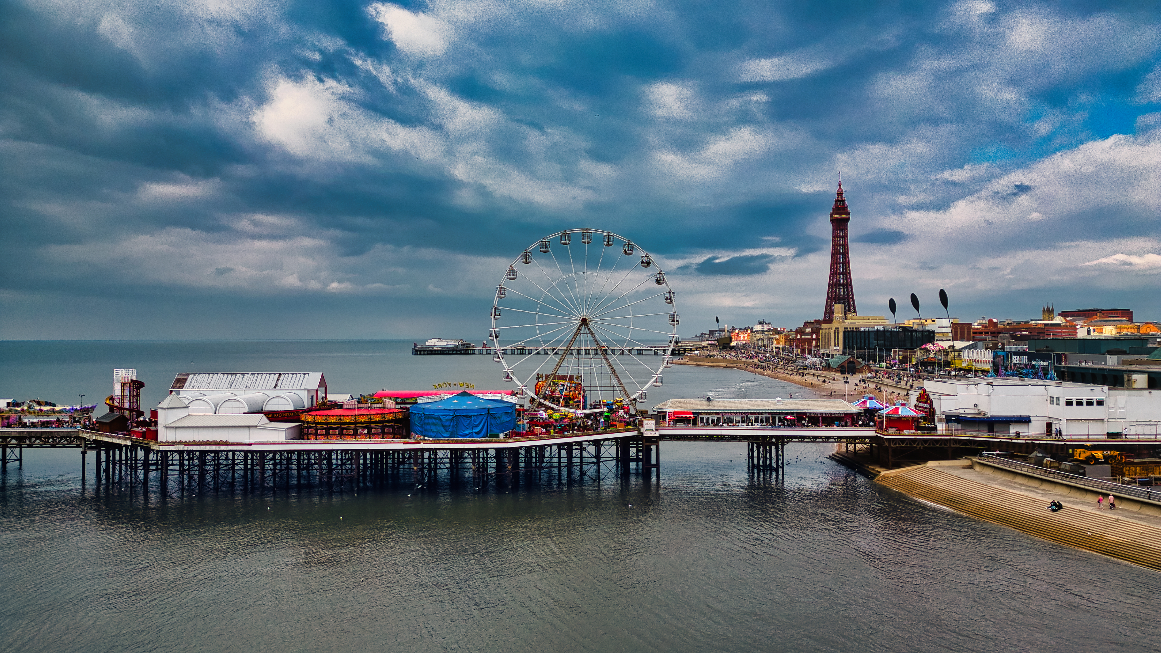 A scenic view of a seaside pier featuring a large ferris wheel and amusement attractions. The sky is overcast with dramatic clouds, and the coastline is visible in the background with buildings and a tower.