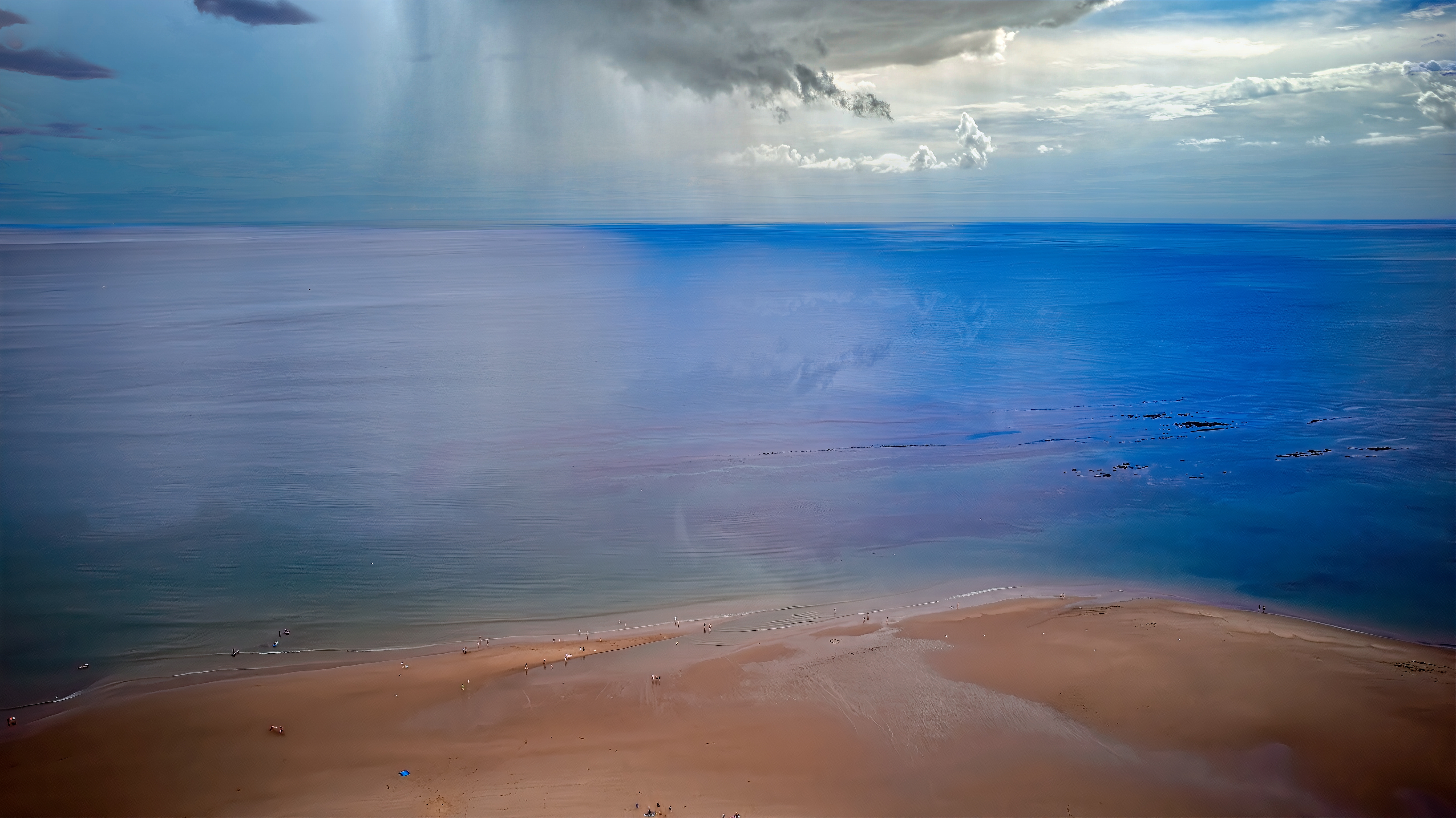 A serene beach scene with a vast expanse of sand meeting a calm ocean under a cloudy sky. The horizon blends seamlessly with the water, creating a tranquil and peaceful atmosphere.