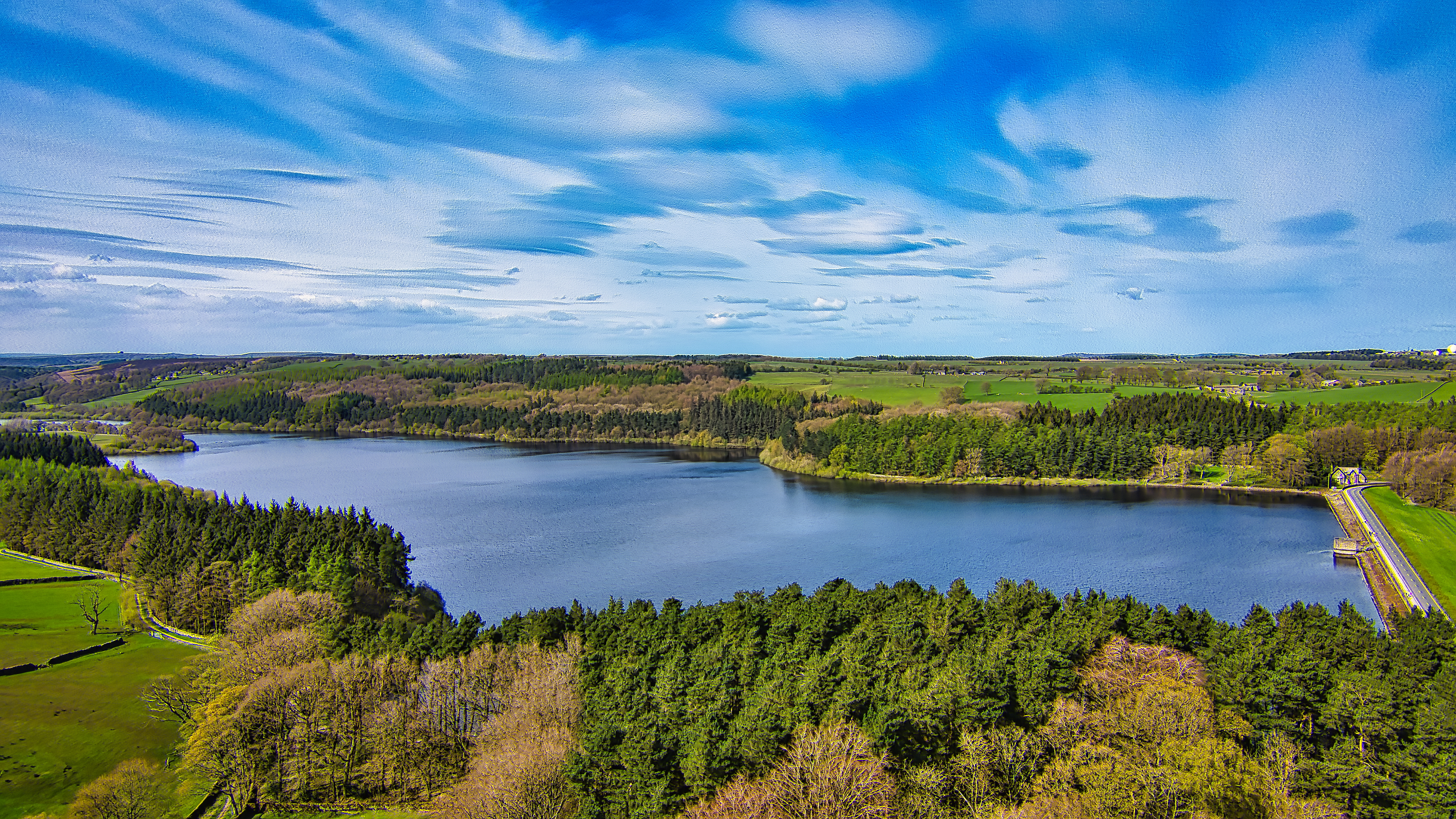 Aerial view of a serene lake surrounded by lush green forests under a vibrant blue sky with scattered clouds.