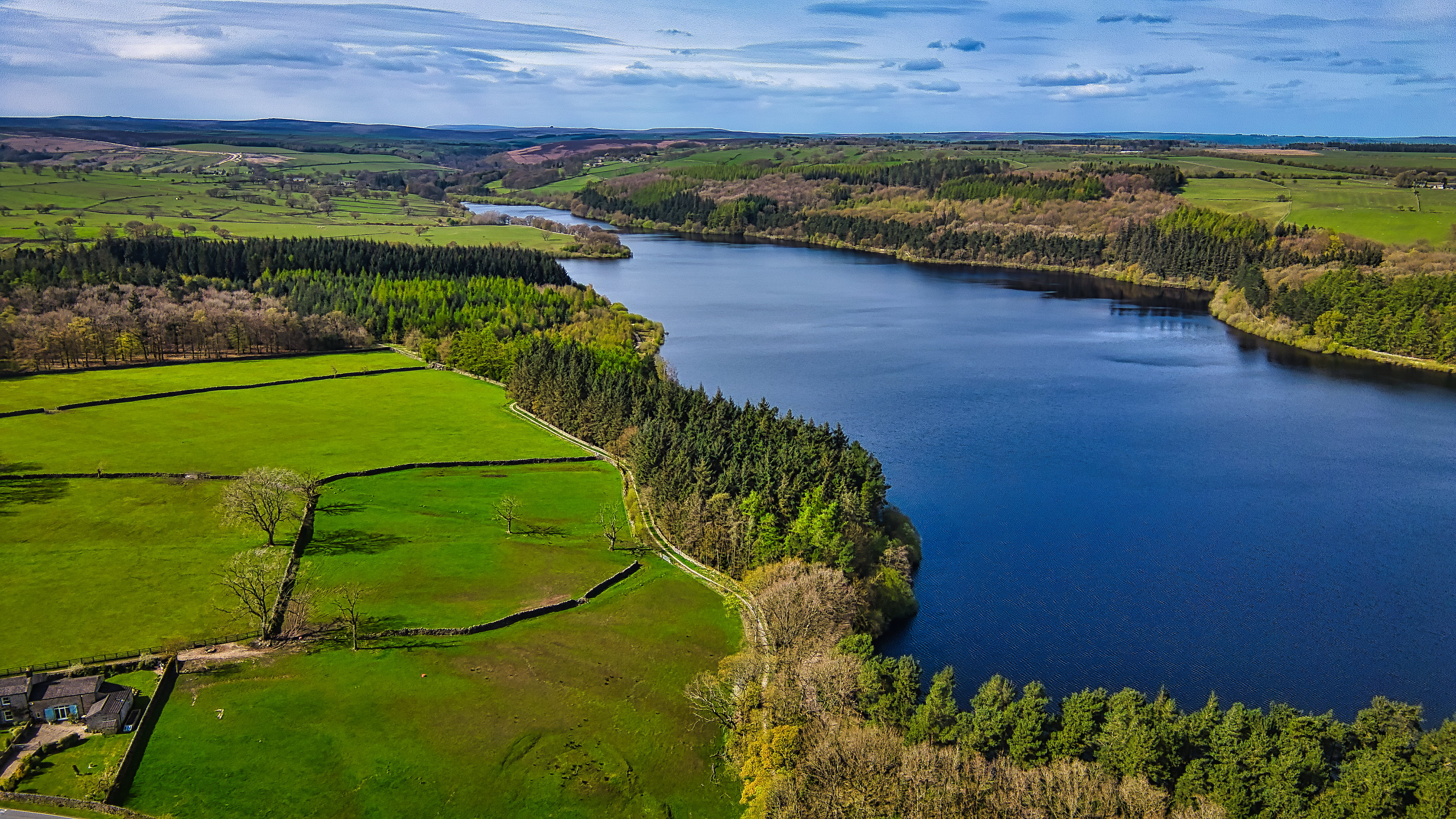 Aerial view of a serene lake surrounded by lush forests and green fields under a clear blue sky.
