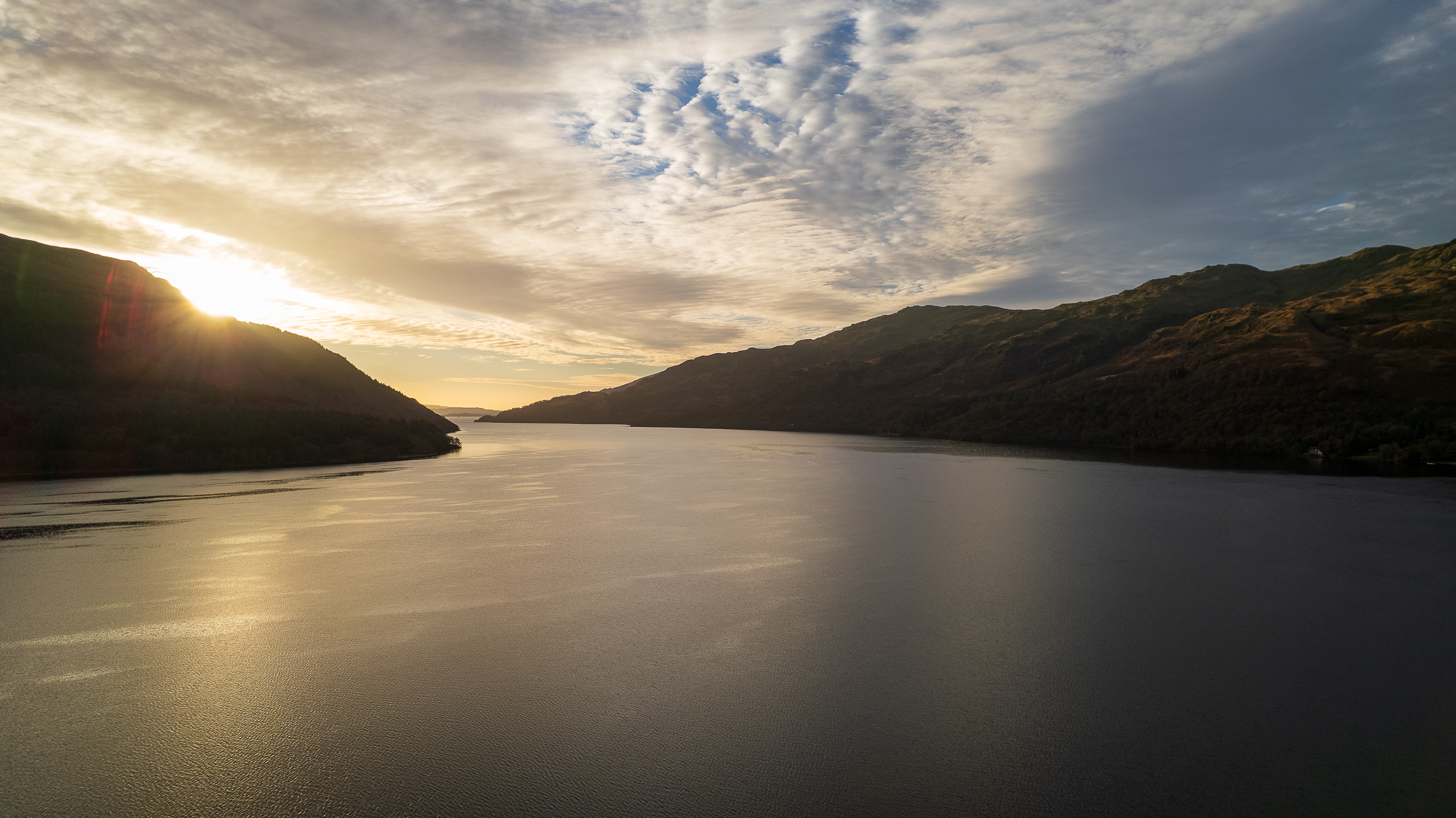 Serene lake at sunset with sun rays piercing through clouds, surrounded by hills.