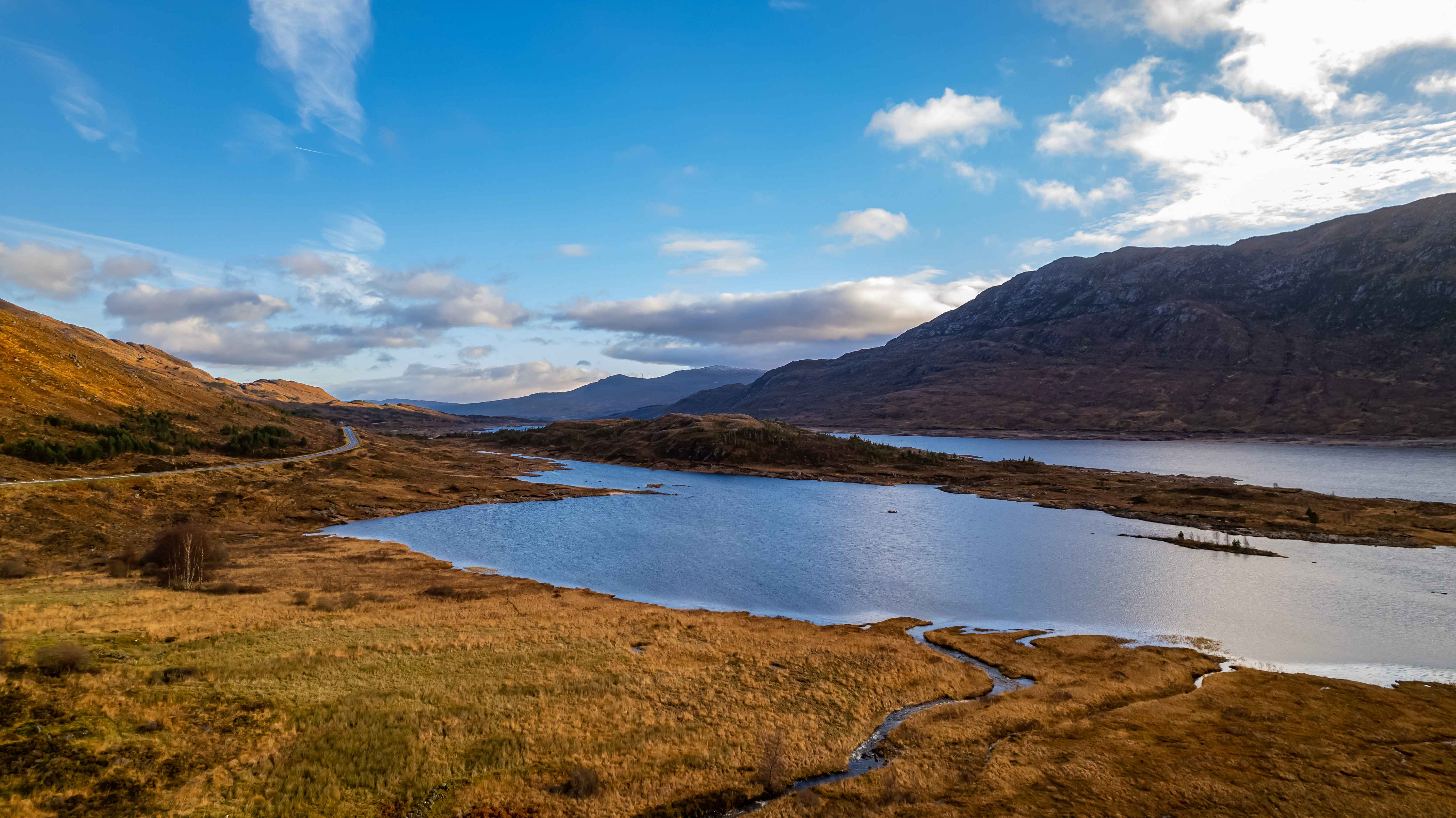 Serene landscape with a calm lake, rolling hills, and a clear blue sky with clouds, reflecting the beauty of untouched nature in Scotland.
