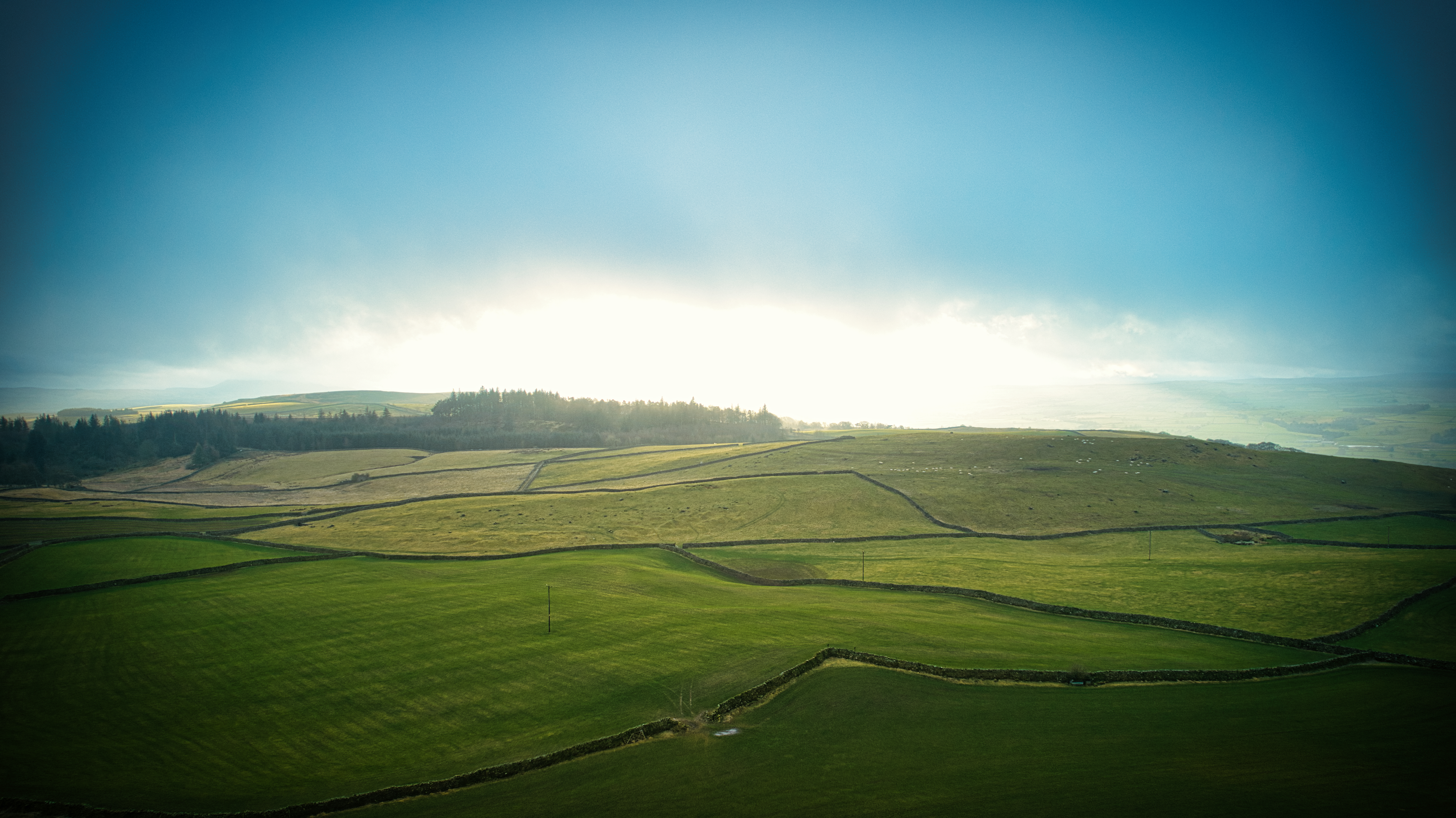 Serene landscape with lush green fields under a clear sky, showcasing the beauty of rural tranquility.