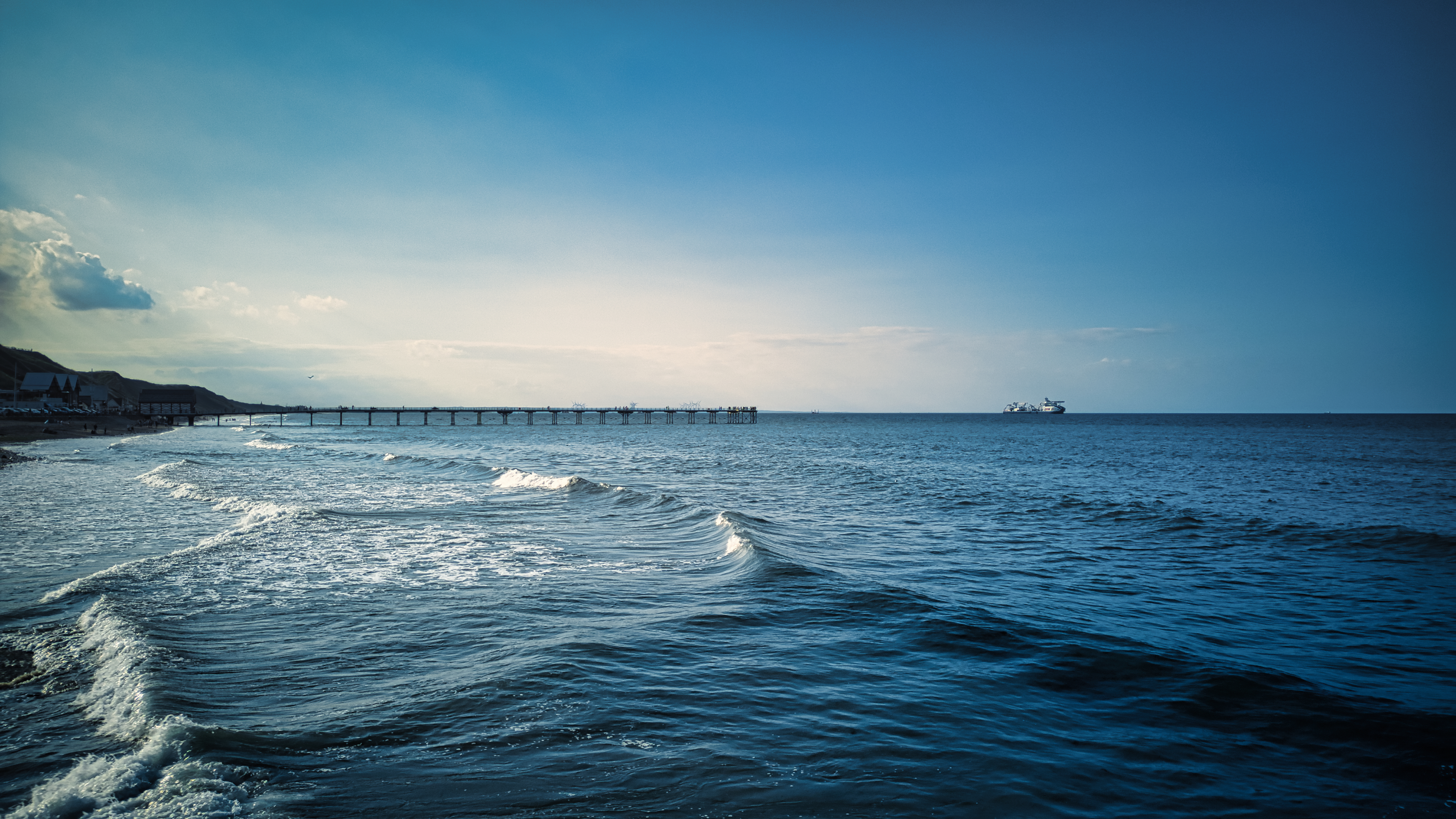 Serene seascape with waves, a distant pier, and a ship on the horizon under a blue sky with clouds in Saltburn-by-the-Sea