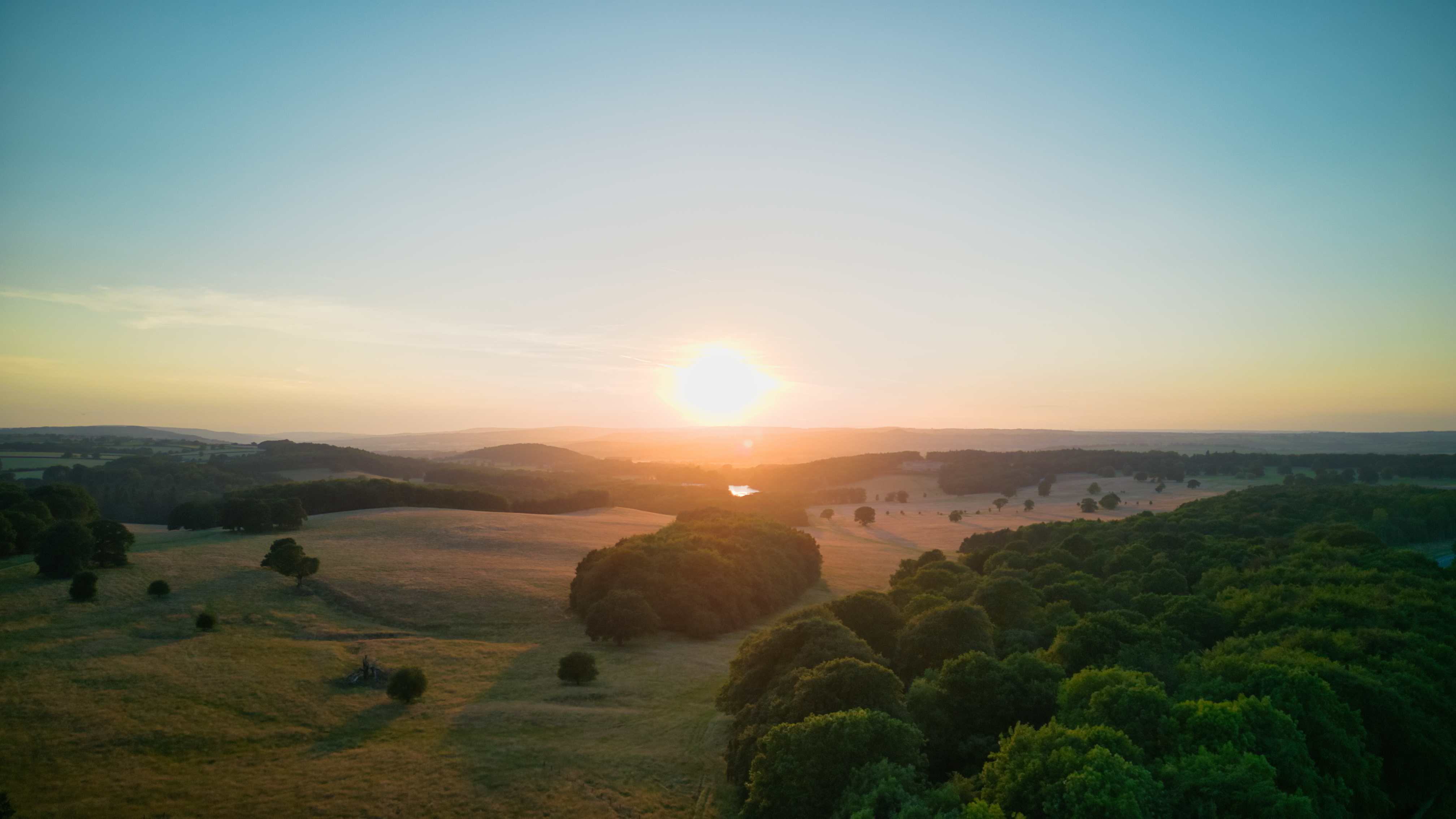 Serene sunrise over a lush valley with gentle hills and scattered trees, casting a warm glow across the landscape in Yorkshire.