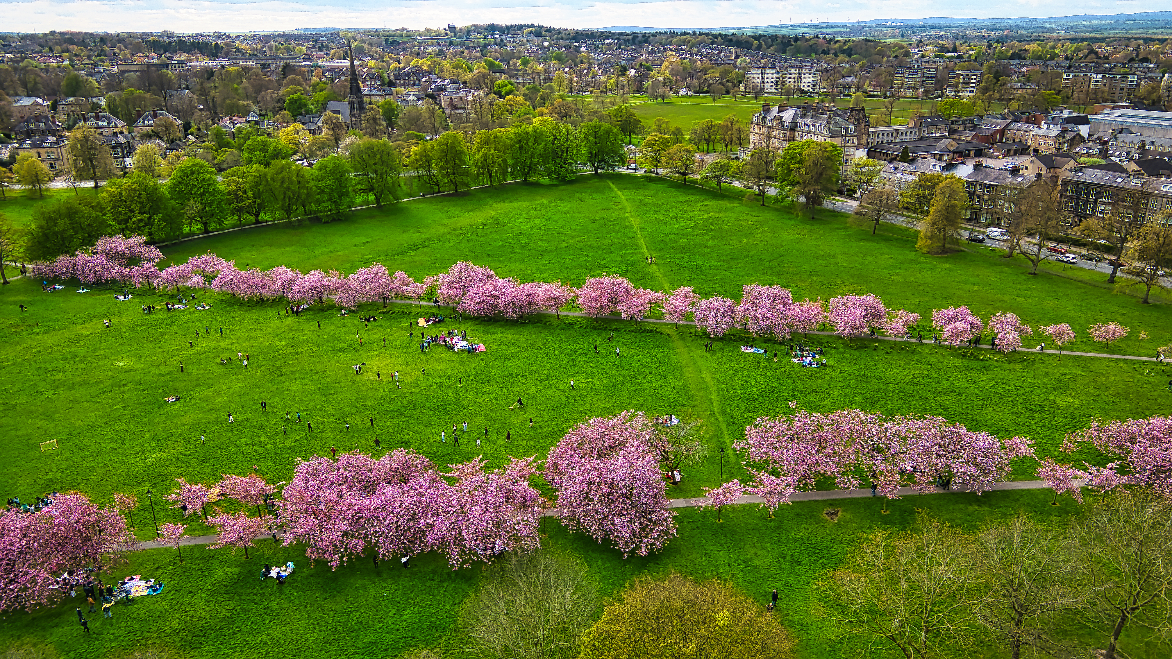 Aerial view of a vibrant park with blooming cherry trees and people enjoying a sunny day, surrounded by a residential area.