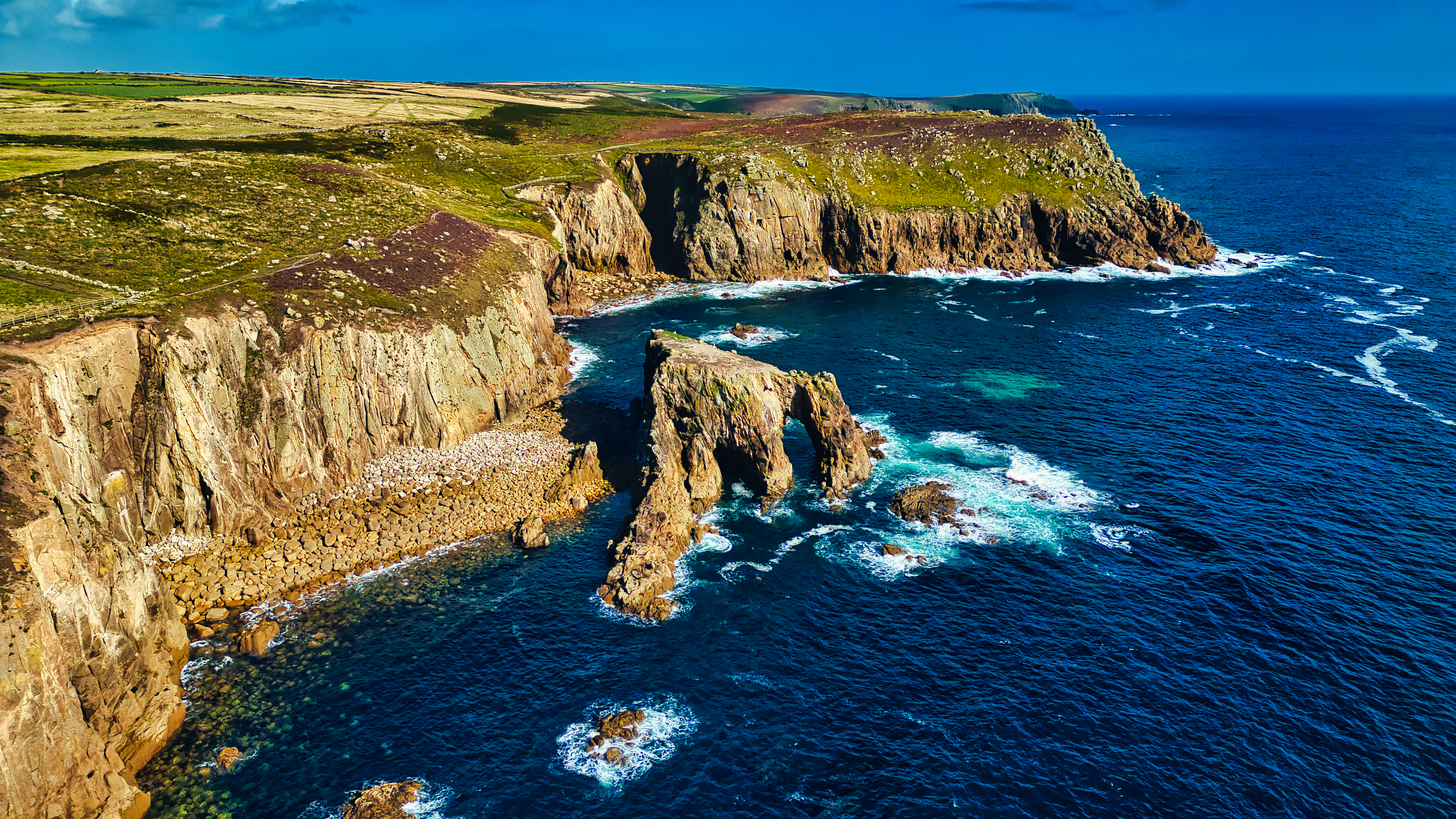 Aerial view of rugged cliffs meeting the ocean, with waves crashing against the rocks. The landscape features green hills and a clear blue sky, showcasing the natural beauty of the coastline.