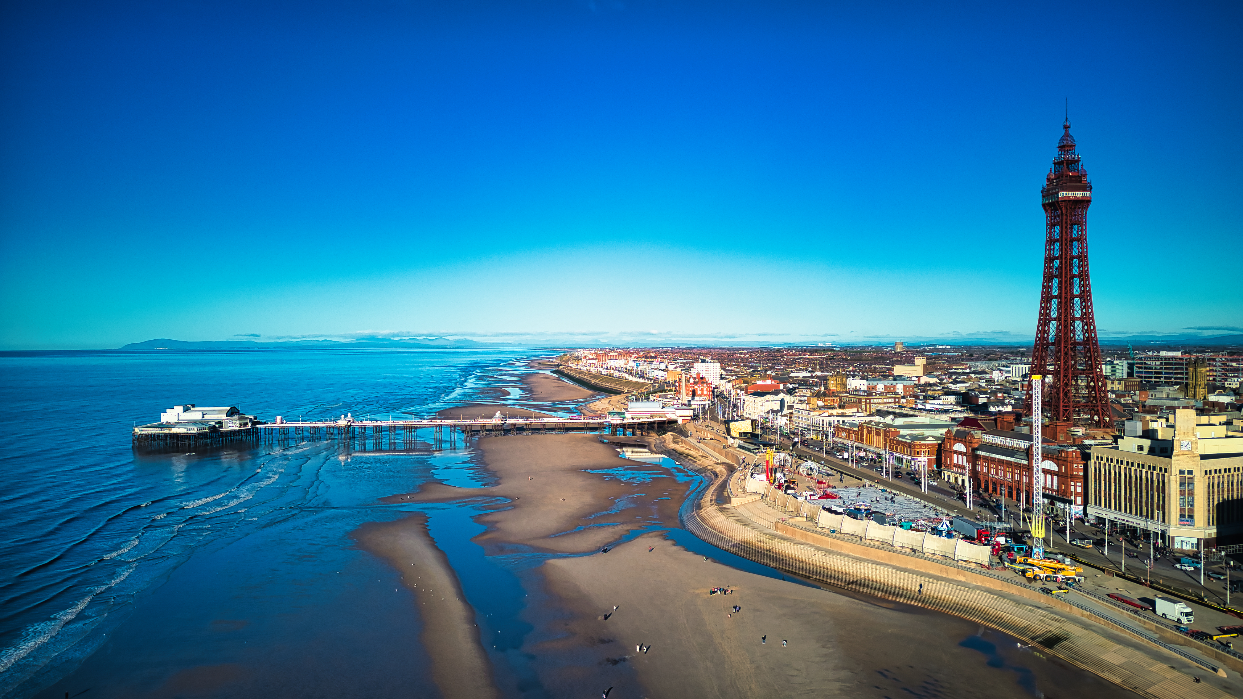 Sunny coastal cityscape with iconic tower, sandy beach, and calm sea under a clear blue sky in Backpool, England.