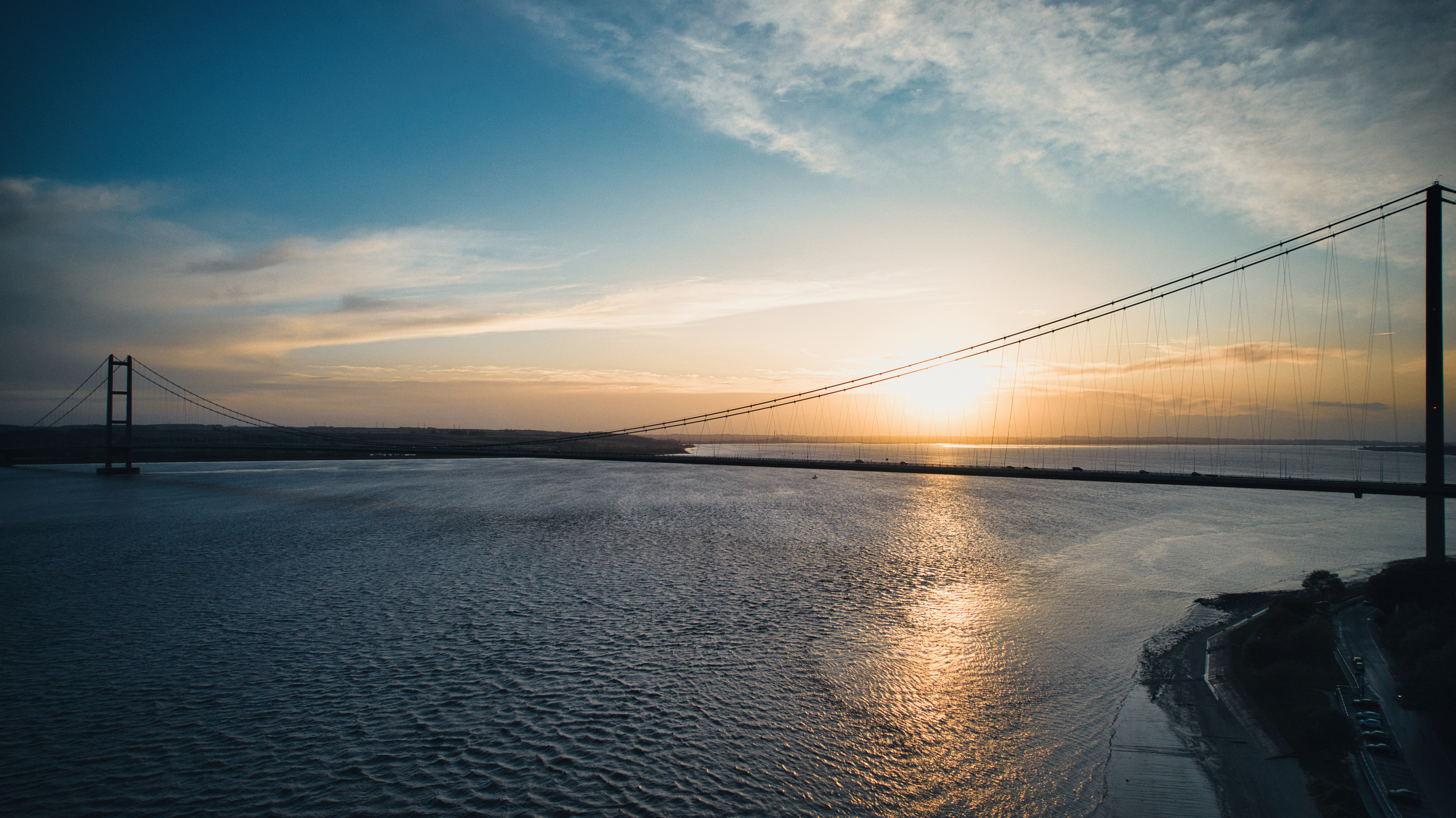 Sunset over a calm river with a silhouette of a suspension bridge against a colorful sky in Hull, England.