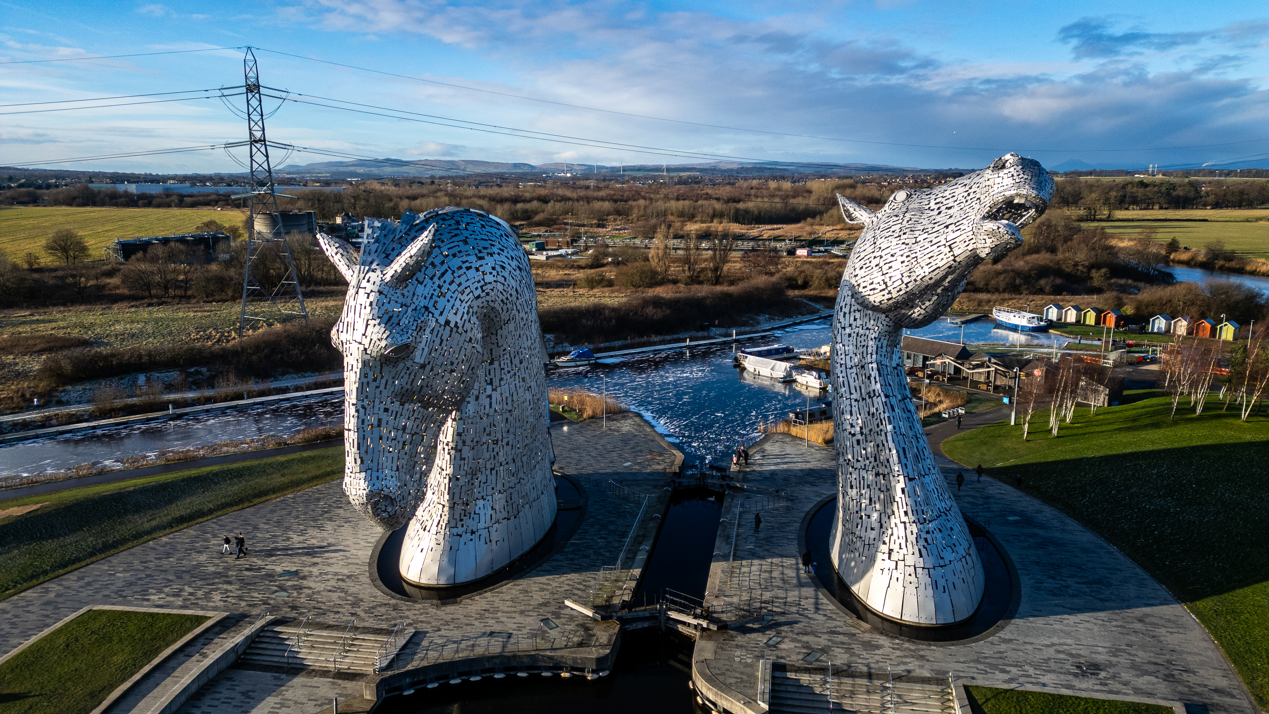 Two monumental stainless steel horse heads, The Kelpies, stand tall against a winter landscape with a partially frozen canal and colorful boat houses.