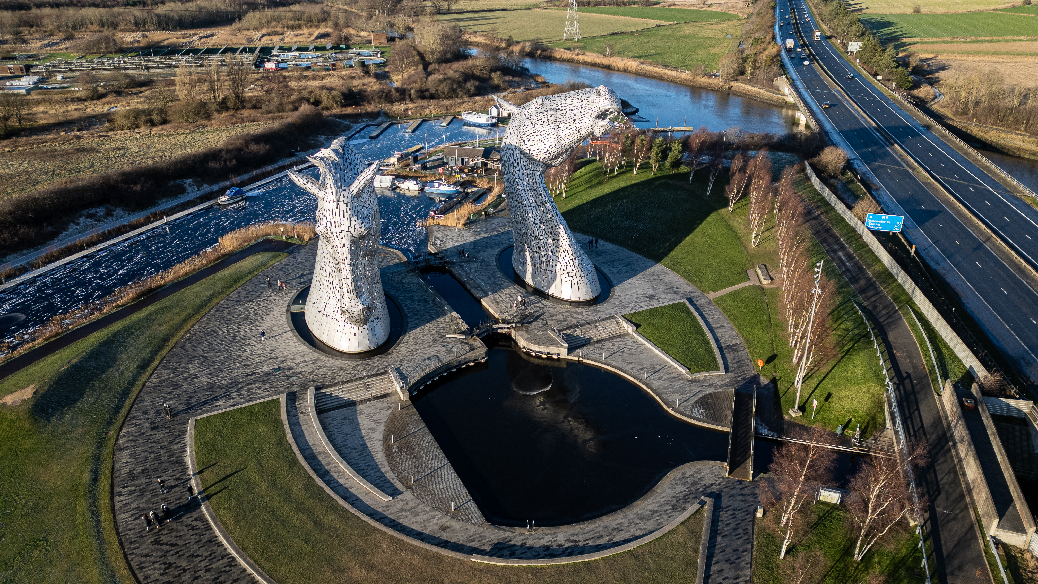 Two large, stainless steel horse head sculptures stand in a paved plaza with a dark water feature. A canal, a highway, and surrounding landscape are visible.