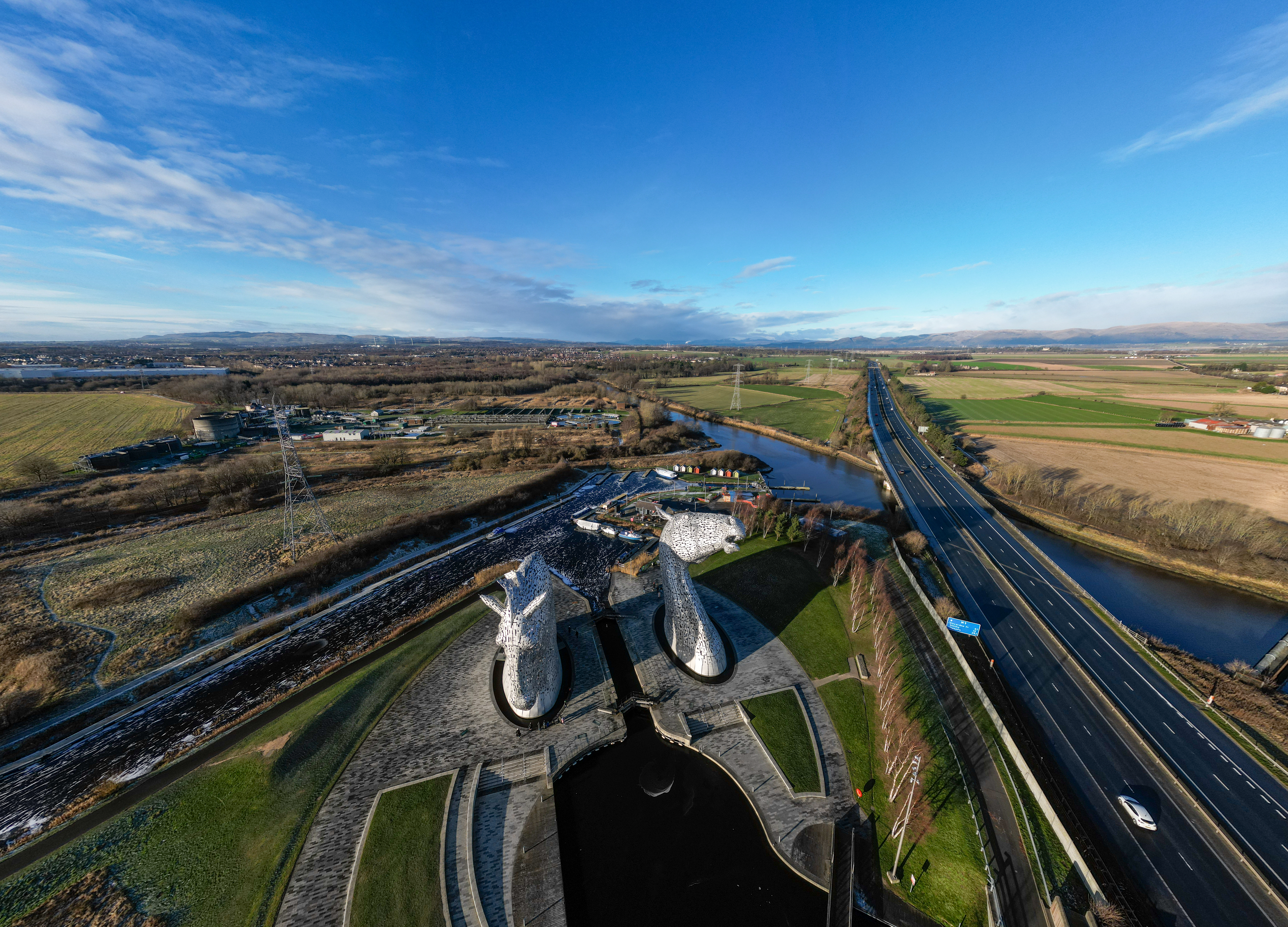 An aerial view of The Kelpies sculptures on a bright day, with a highway and canal flanking the landscape.