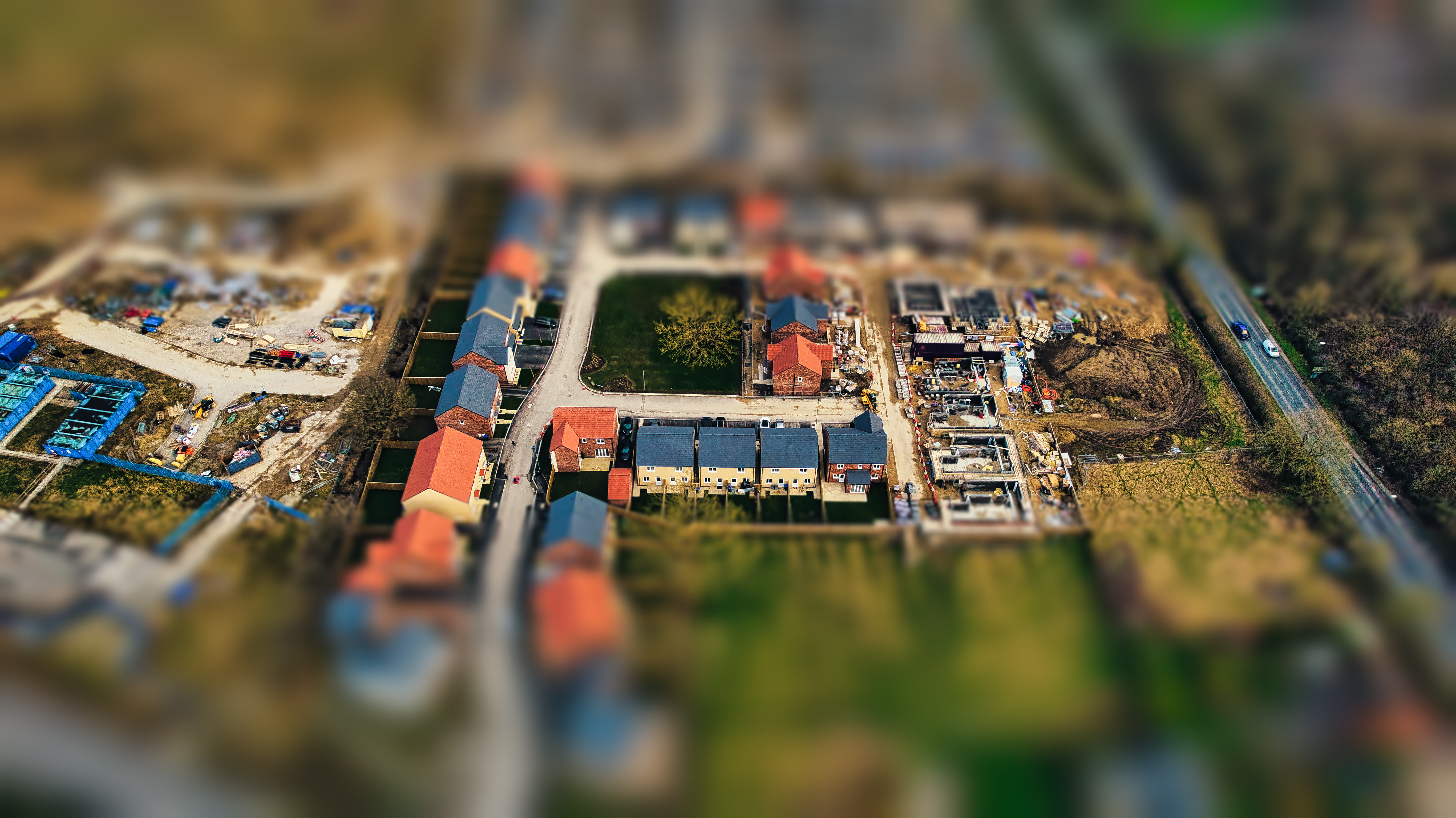 Tilt-shift aerial view of a residential neighborhood, giving a miniature effect to the houses and streets in Harrogate, North Yorkshire.