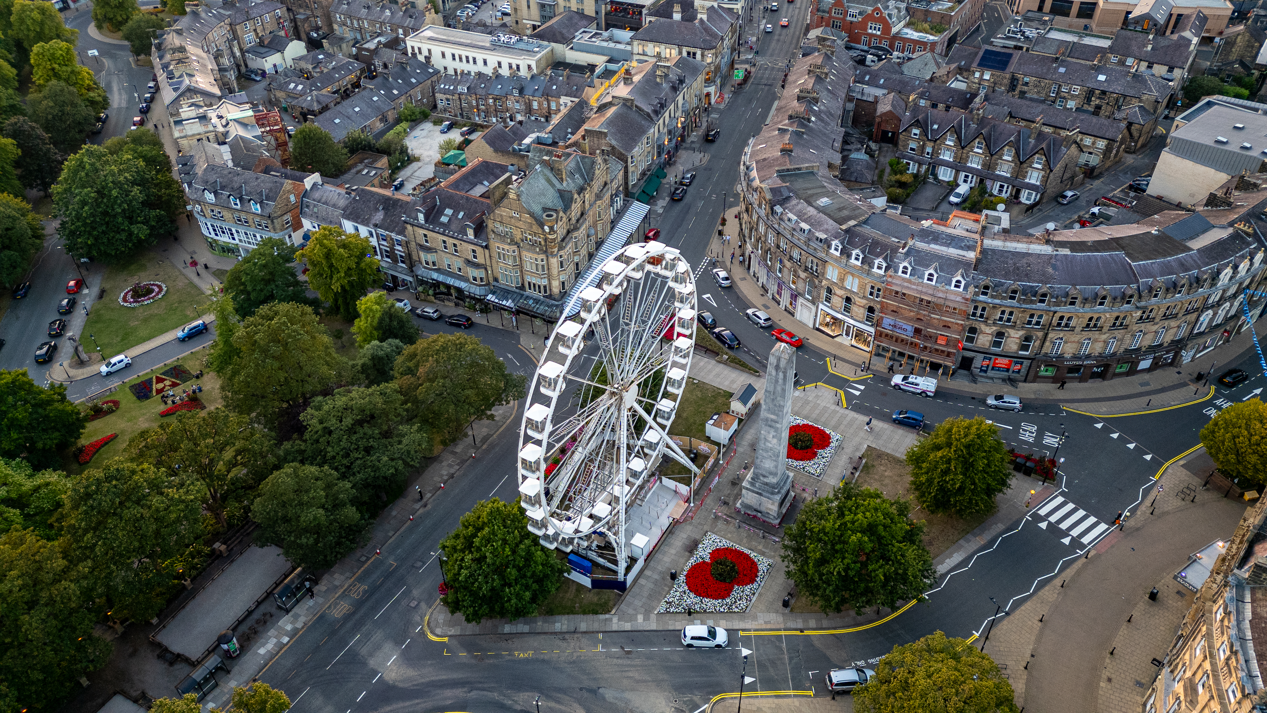 An aerial view captures a Ferris wheel in a town square surrounded by buildings and trees, with a monument and poppy displays in Harrogate, UK.