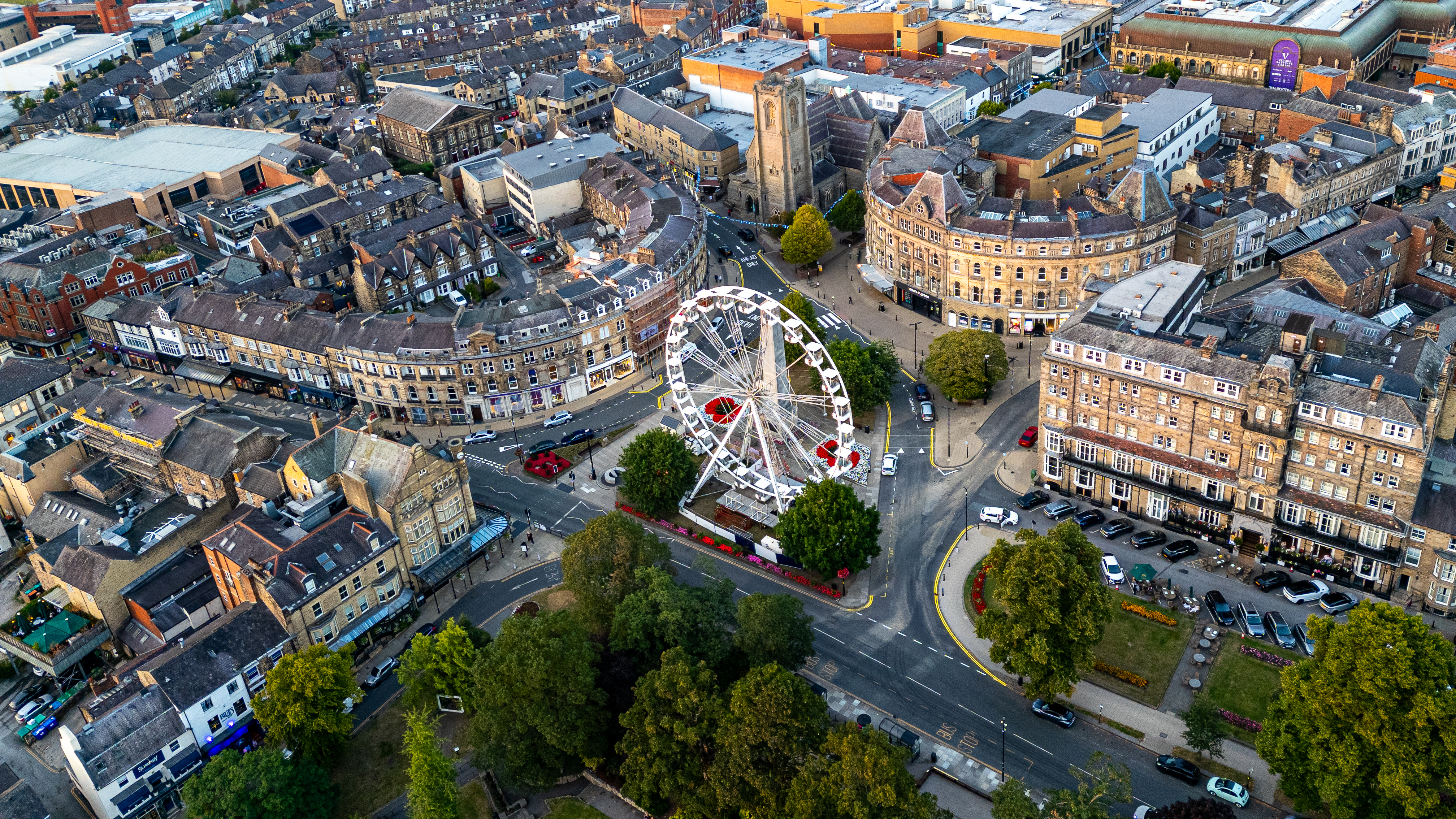 Aerial view of a town square featuring a Ferris wheel, diverse architecture, and surrounding trees and roads with vehicles in Harrogate, UK.