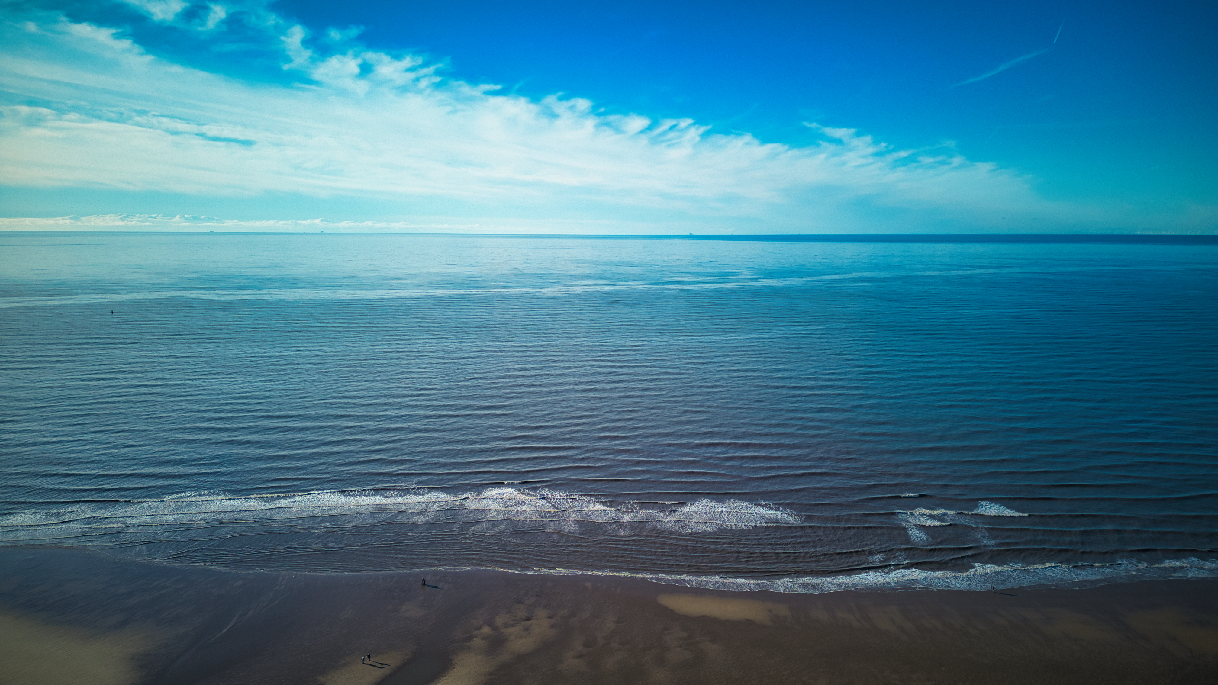 Tranquil seascape with gentle waves, clear sky, and beach in Backpool, England.