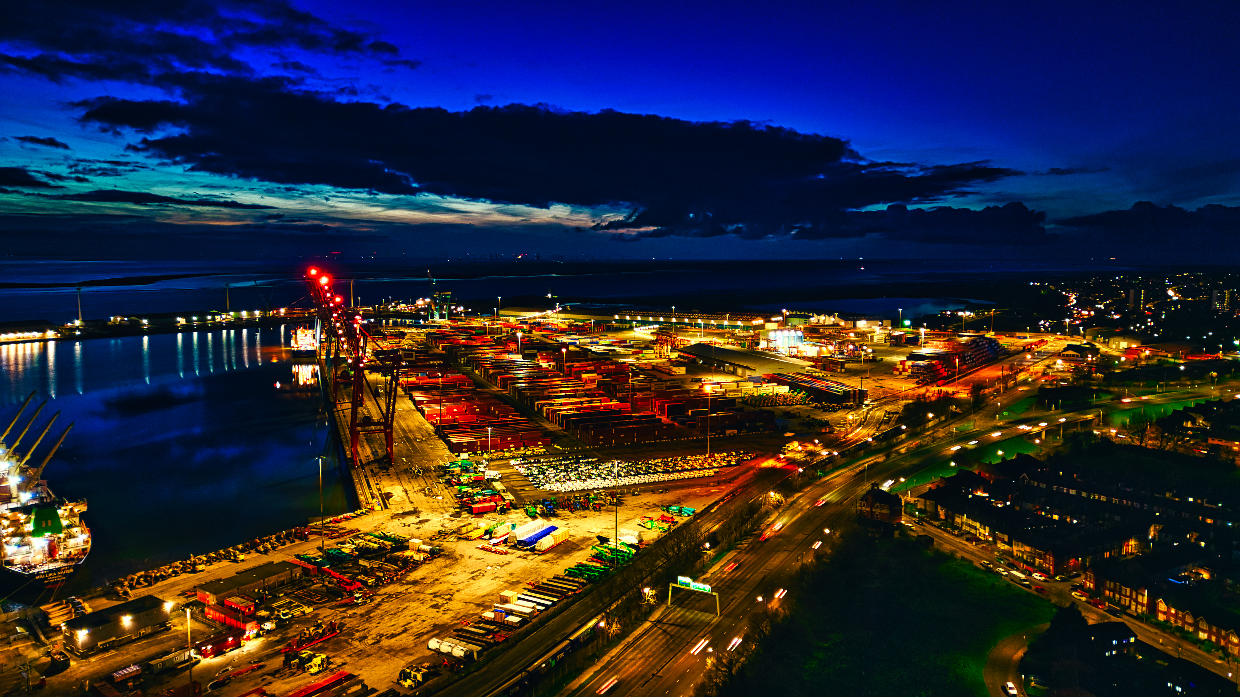 Twilight cityscape of a bustling port with illuminated cranes and docks, reflecting vibrant nightlife and industrial activity in Liverpool, UK.