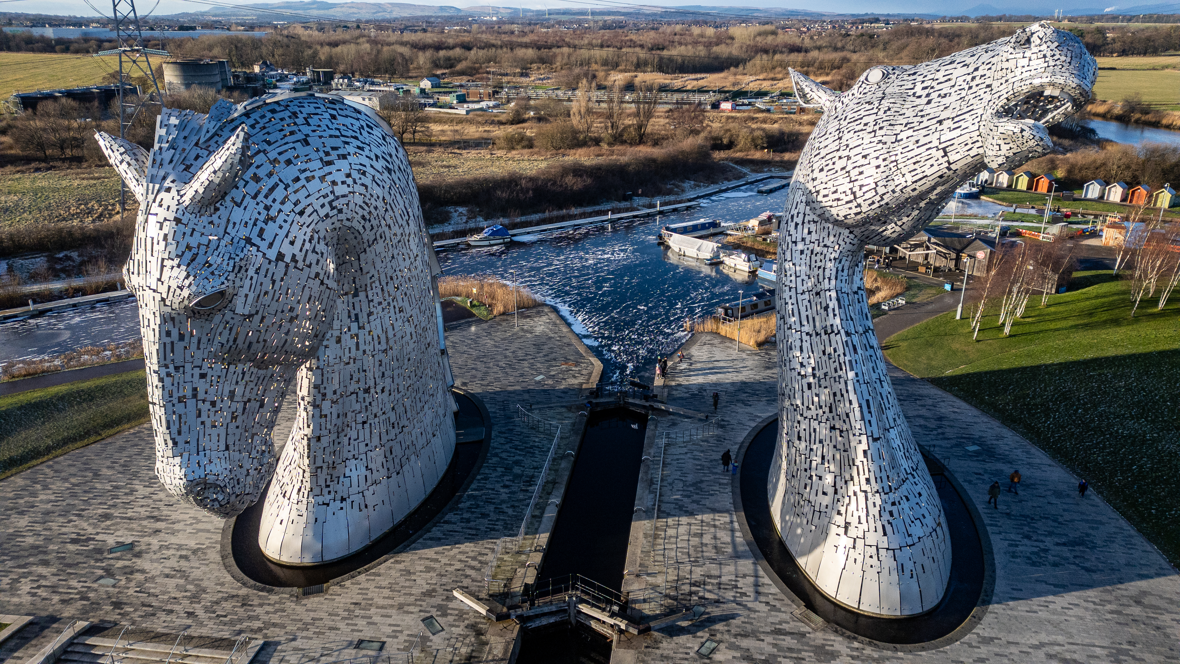 Two colossal stainless steel horse heads dominate a paved area next to a partially frozen canal with boats. The background shows a landscape with trees, buildings, and power lines under a clear sky.