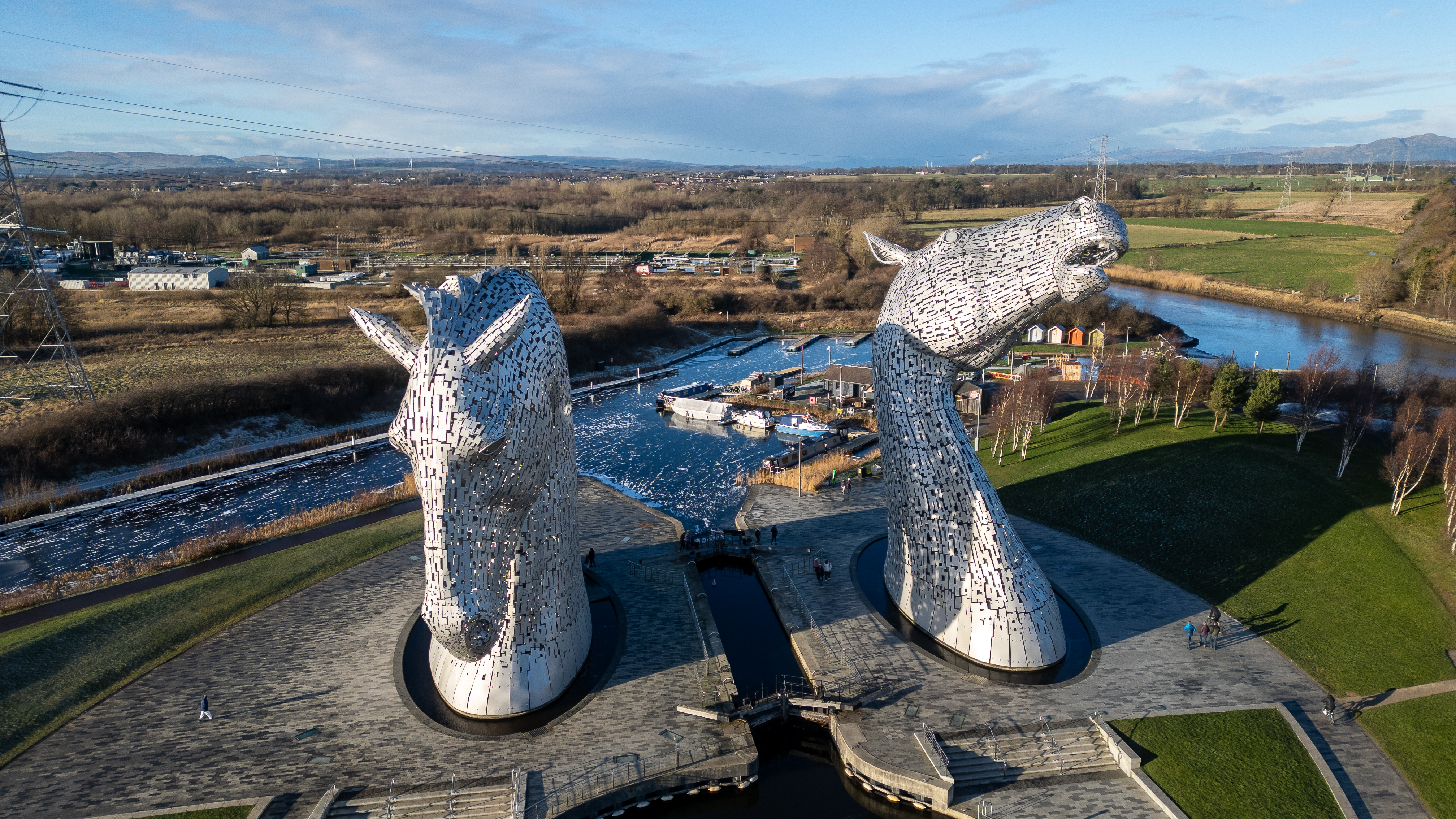 Two colossal horse head sculptures, made of steel, dominate the foreground, set against a landscape of a canal, marina, and distant hills under a bright sky.