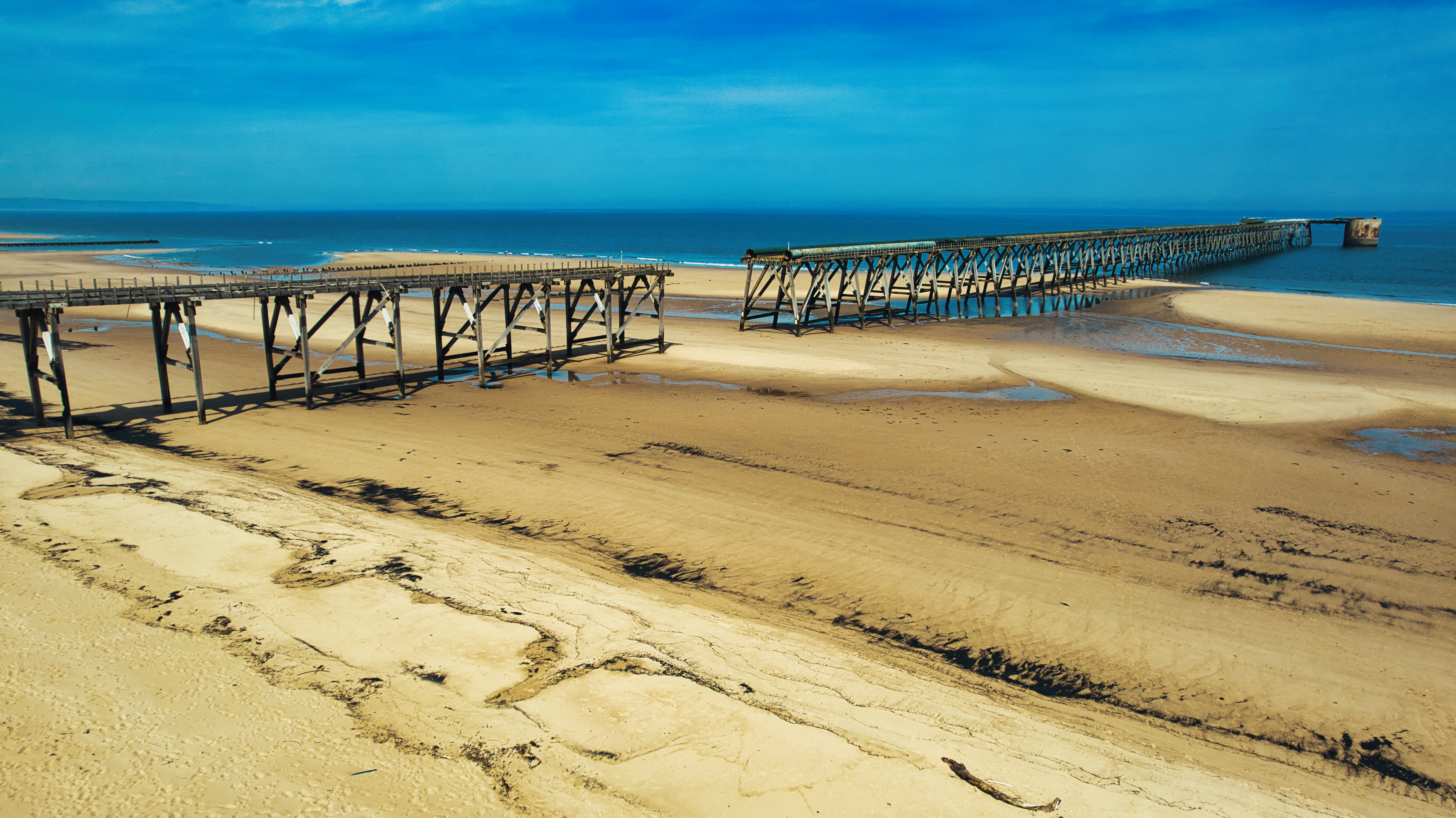 Wide shot of two wooden piers stretching out over a sandy beach towards the ocean, under a clear blue sky at Steetley Pier, UK.