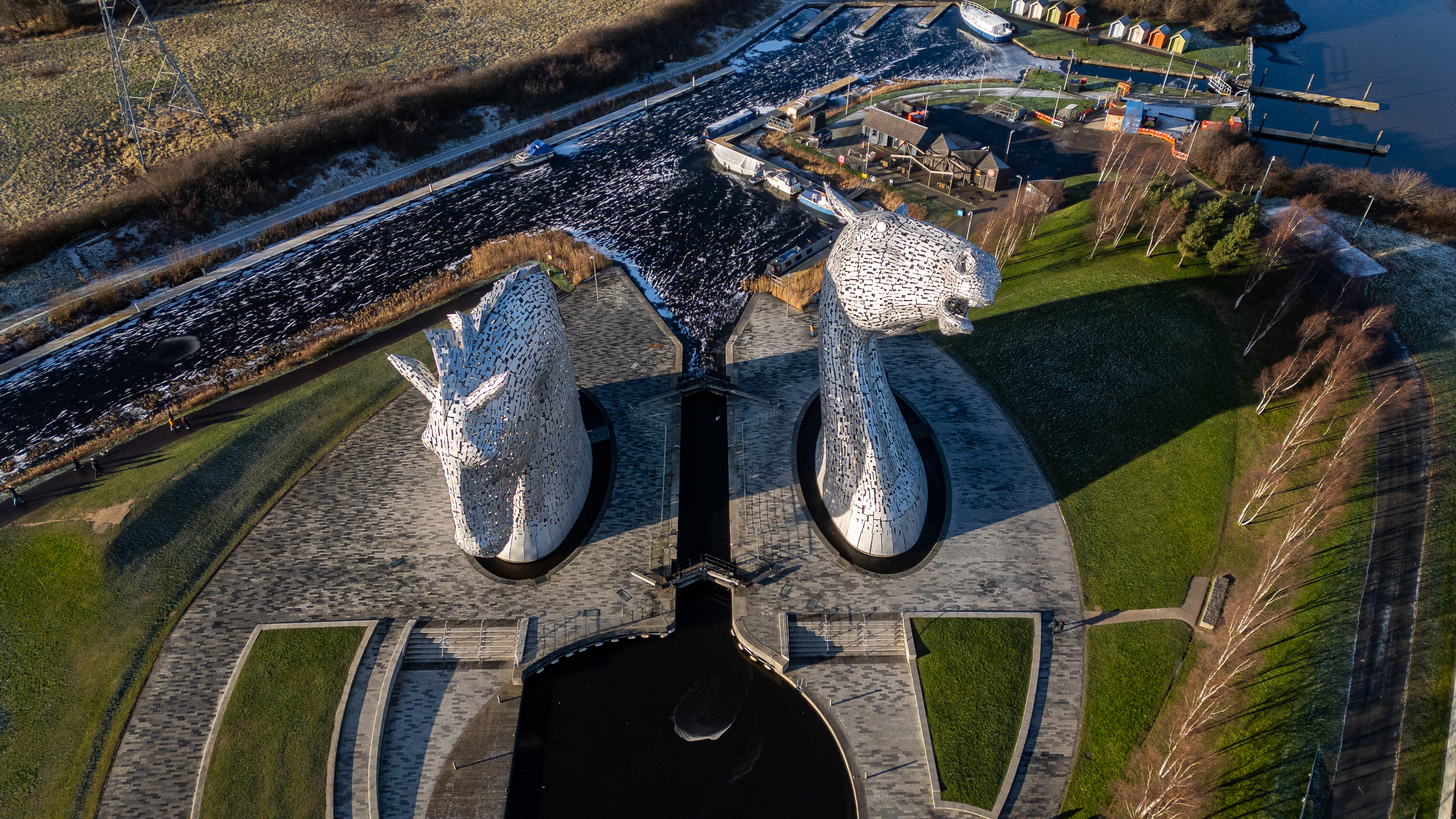 An aerial view shows two large, white, horse-head sculptures on a paved plaza next to a canal and grassy areas.