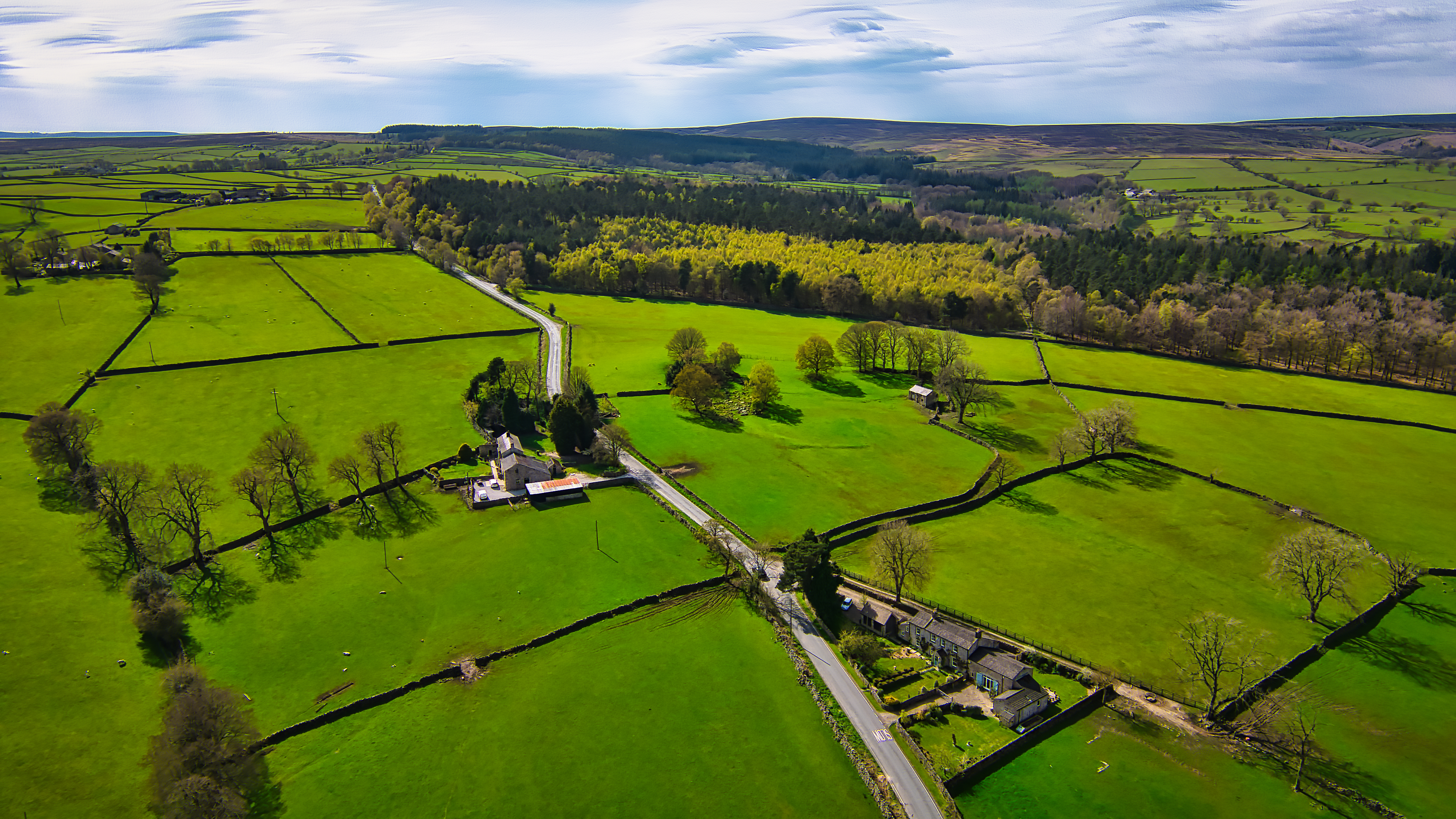 Aerial view of a lush green countryside with a road dividing fields and a small settlement, showcasing vibrant green fields and scattered trees under a clear sky.