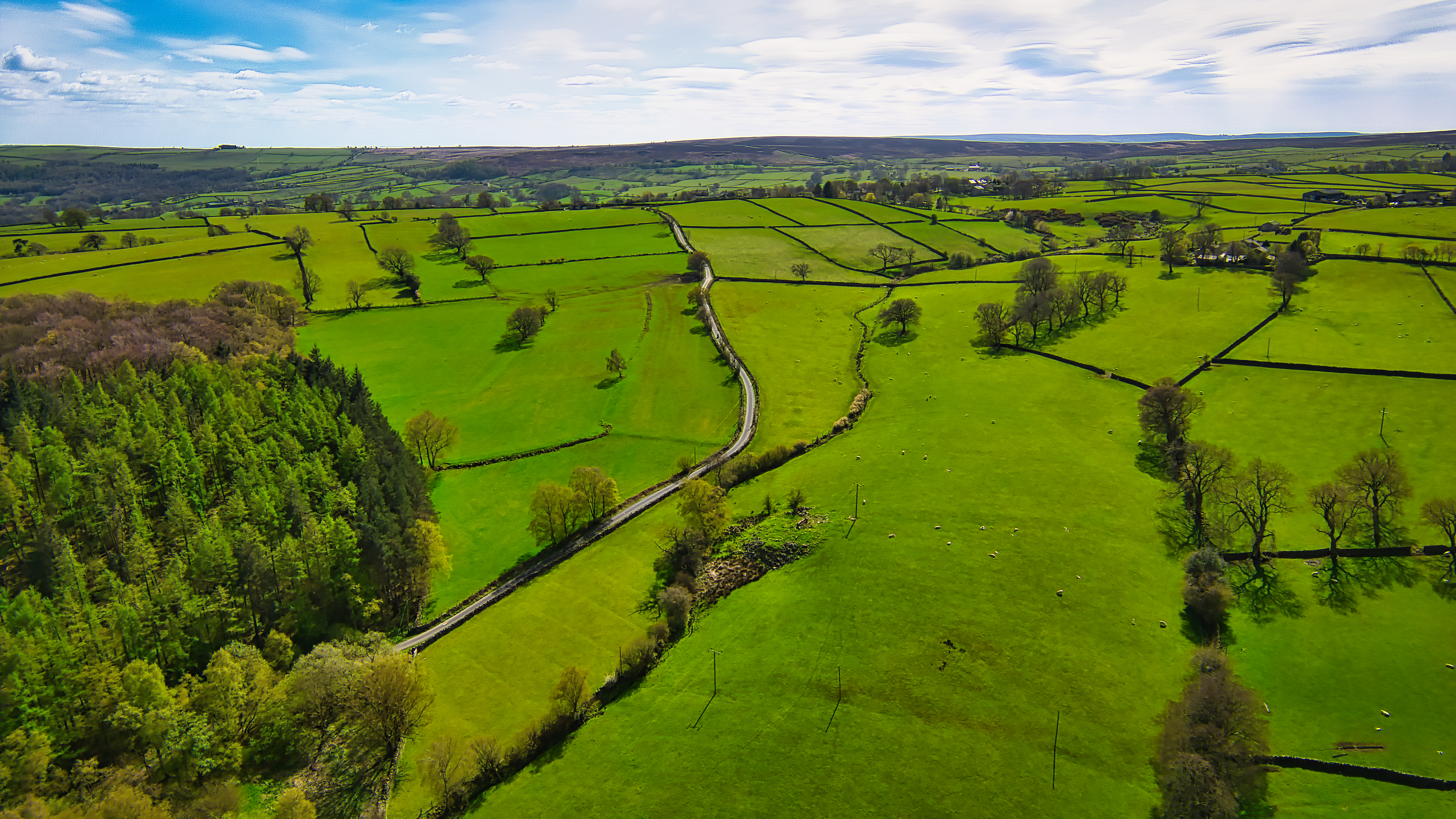Aerial view of a lush green countryside with a winding road, divided fields, and patches of trees under a clear blue sky.