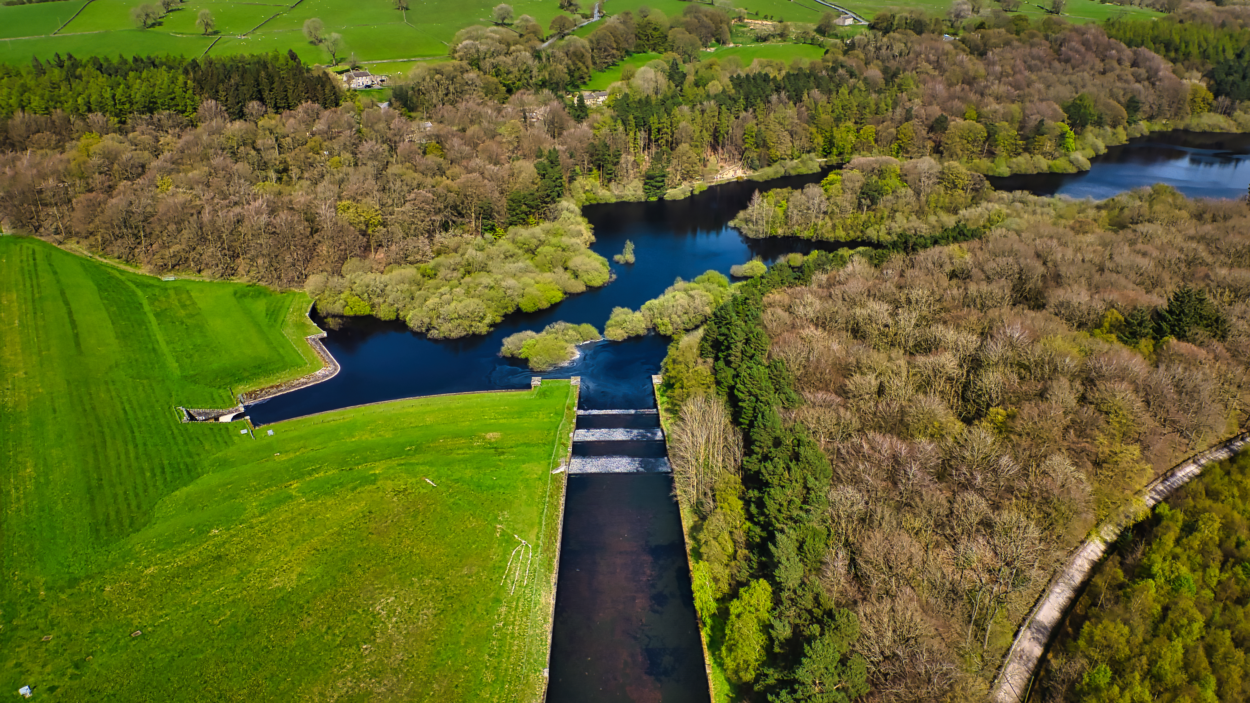 Aerial view of a lush green landscape featuring a river, lakes, and dense forests under a clear sky in Yorkshire