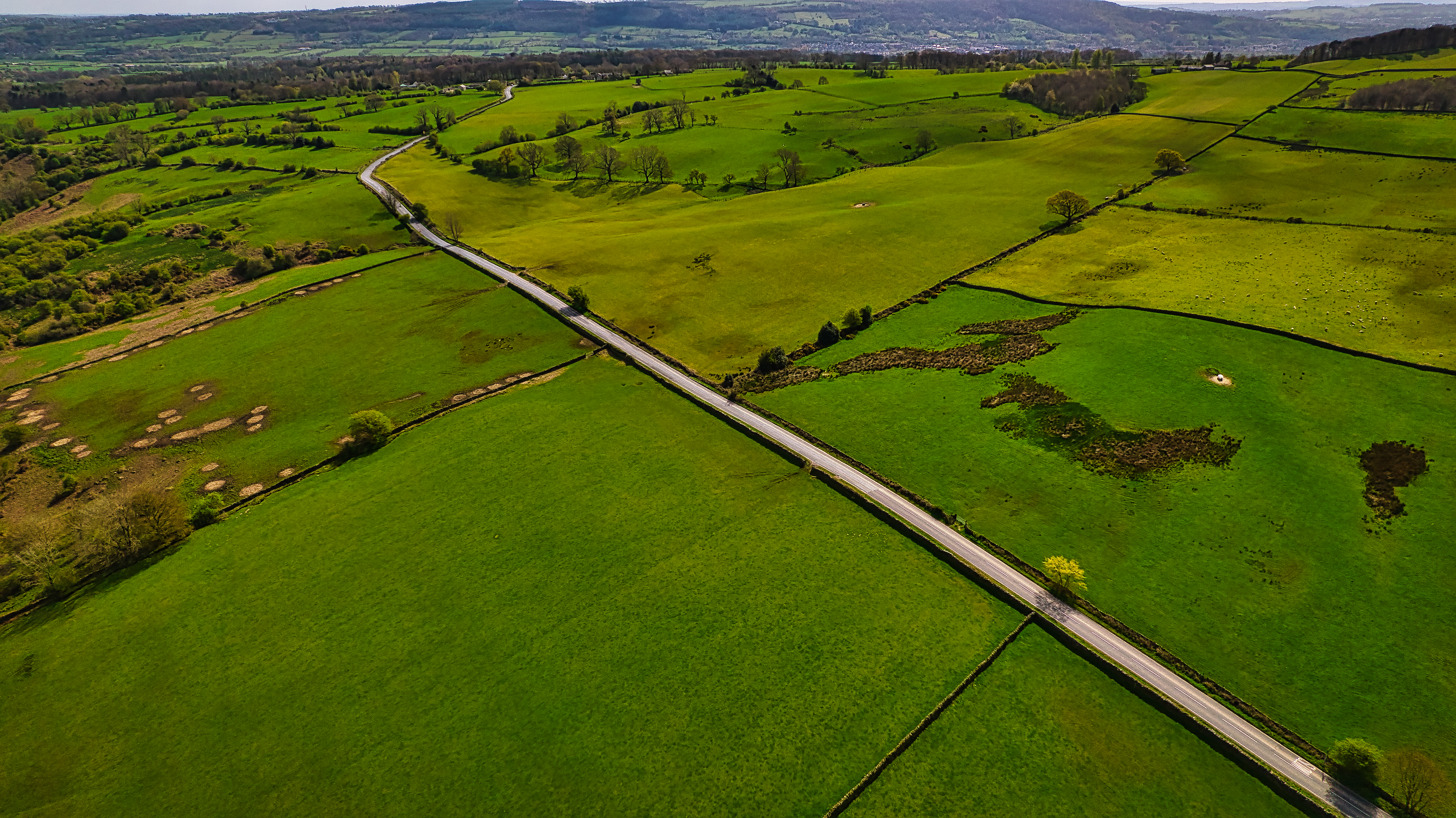 Aerial view of a lush green landscape with a winding road cutting through. Fields and scattered trees are visible, creating a vibrant rural scene.