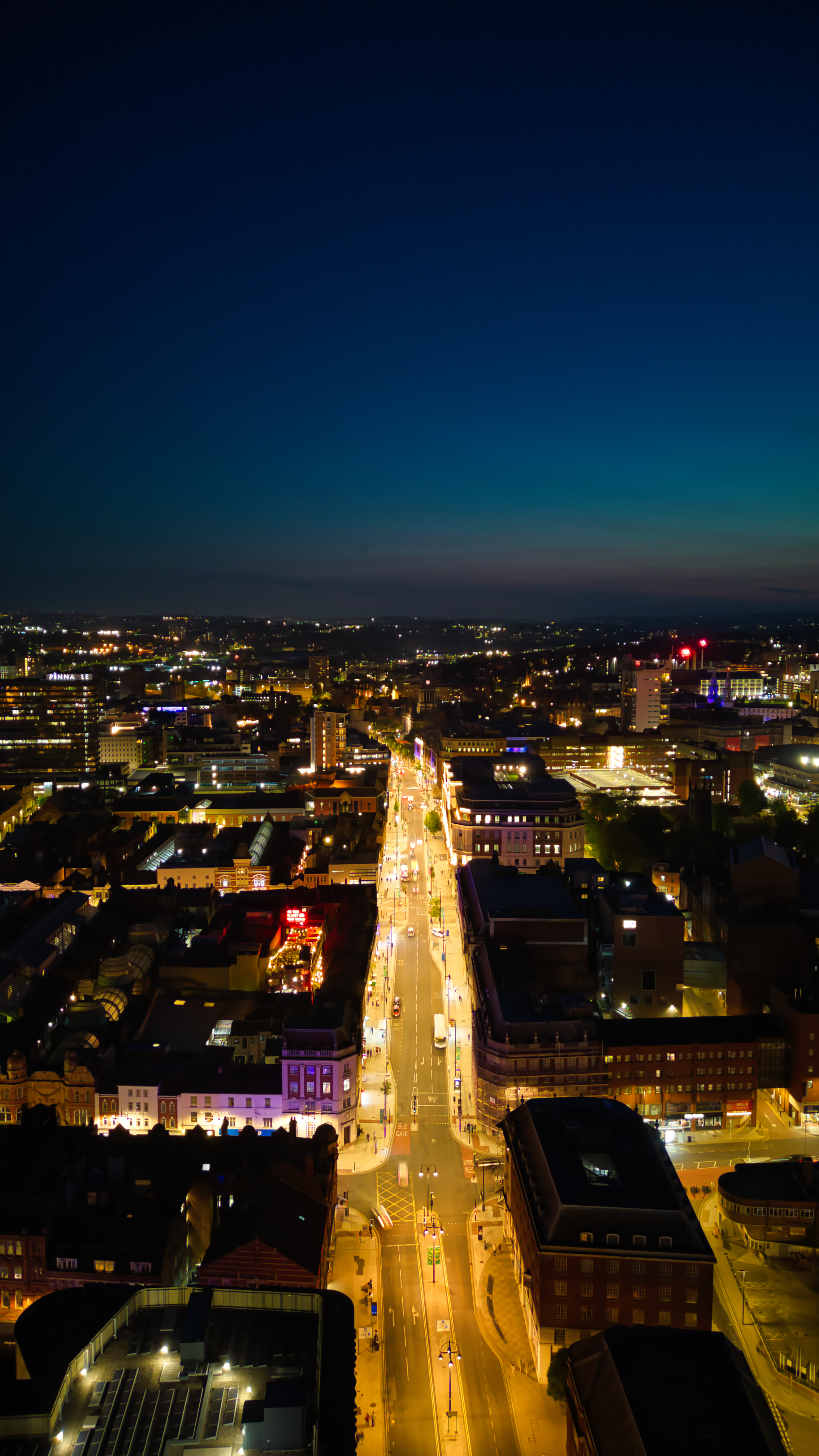 Vertical aerial view of a city at twilight with street lights and buildings, showcasing urban nightlife in Leeds.