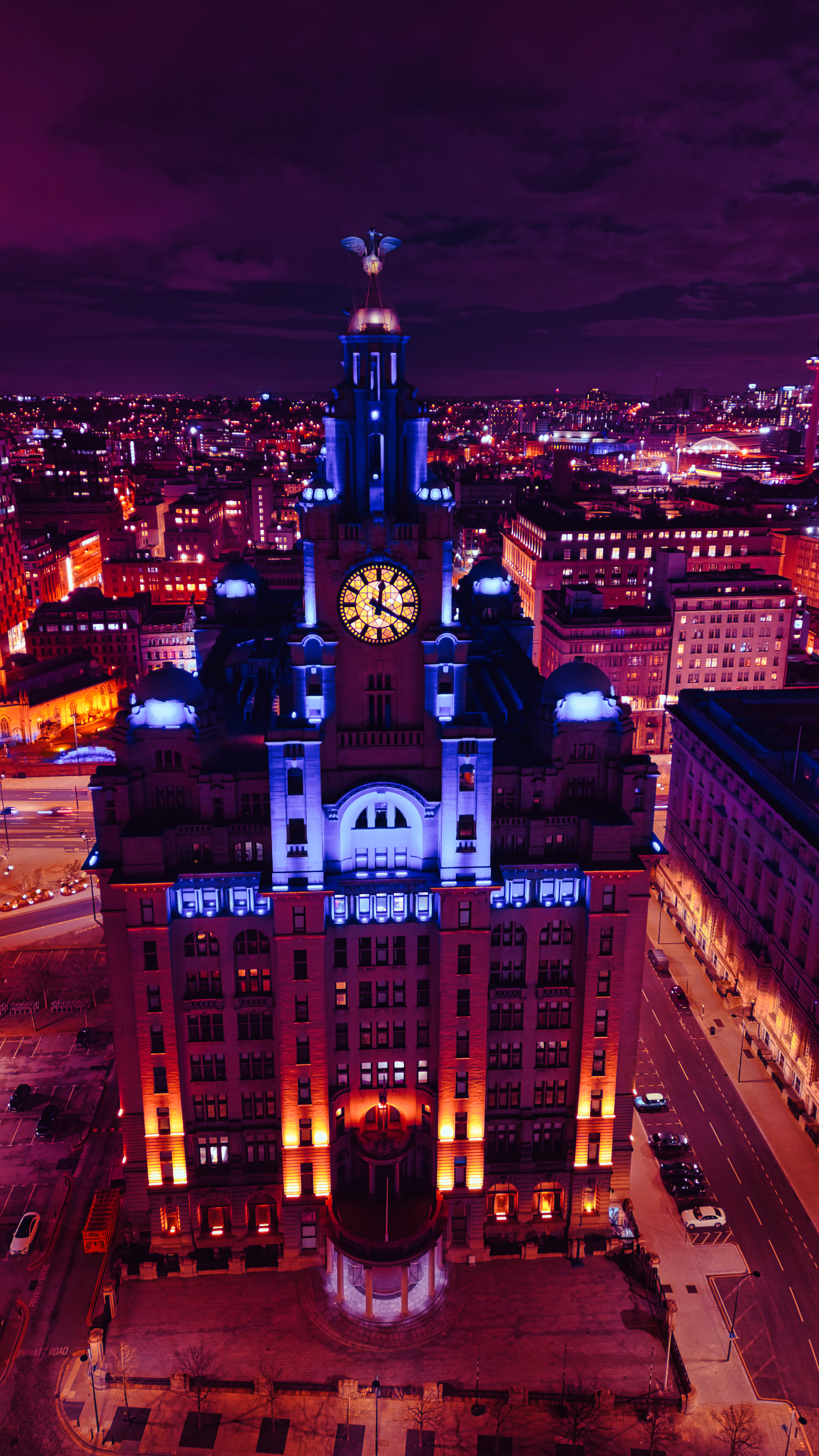 Vertical aerial view of an illuminated historic building at night with city lights in the background in Liverpool, UK.