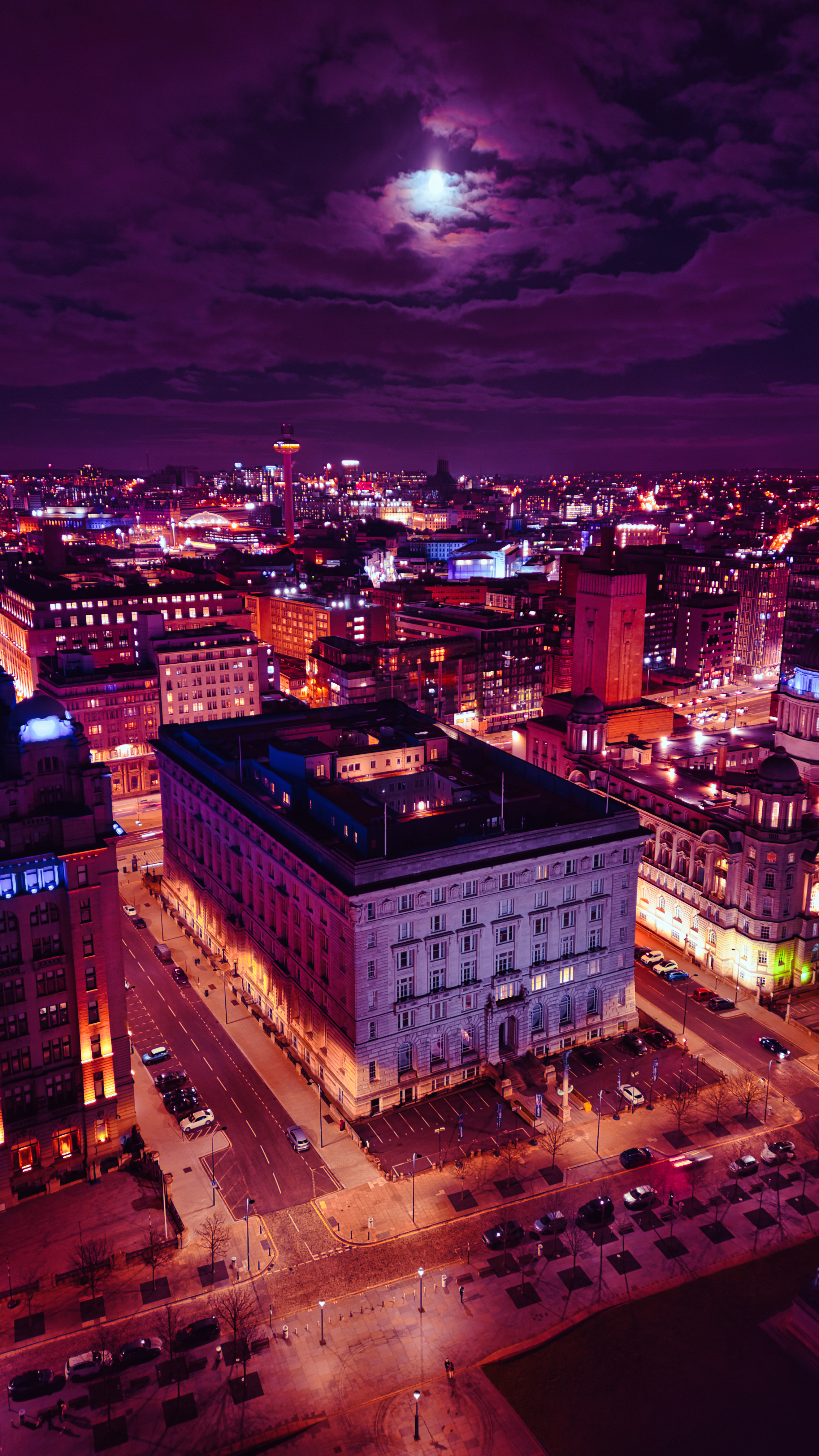 Vertical aerial view of an illuminated historic building at night with city lights in the background in Liverpool, UK.