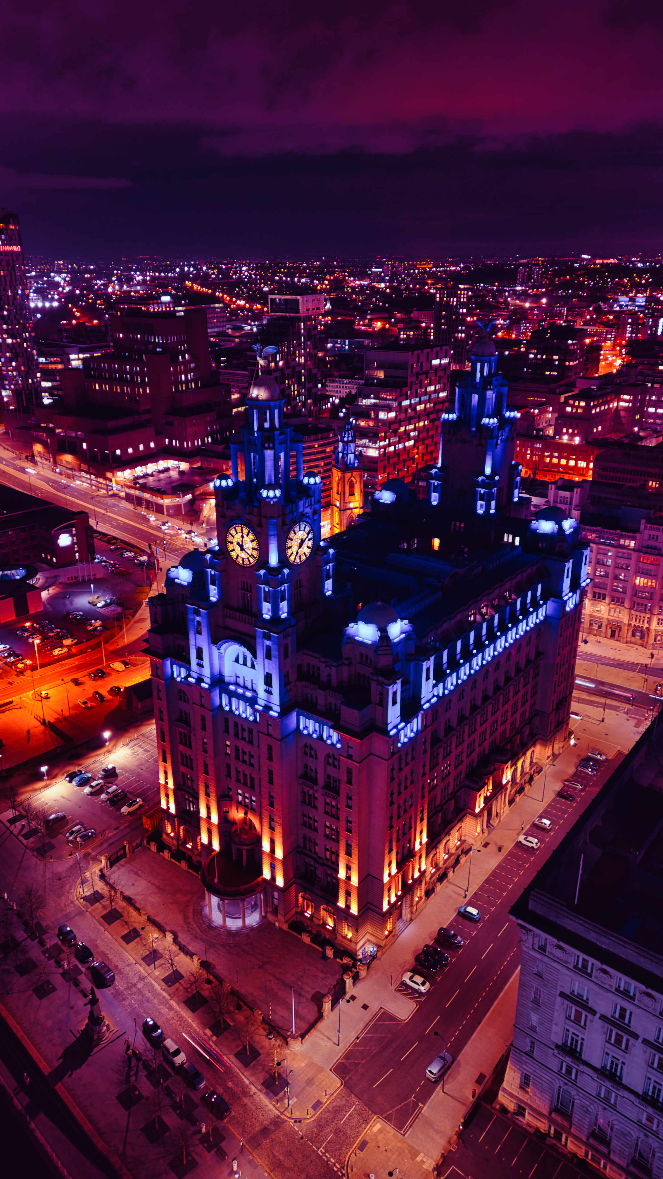 Vertical cityscape at night with illuminated historic building against a purple sky in Liverpool, UK.