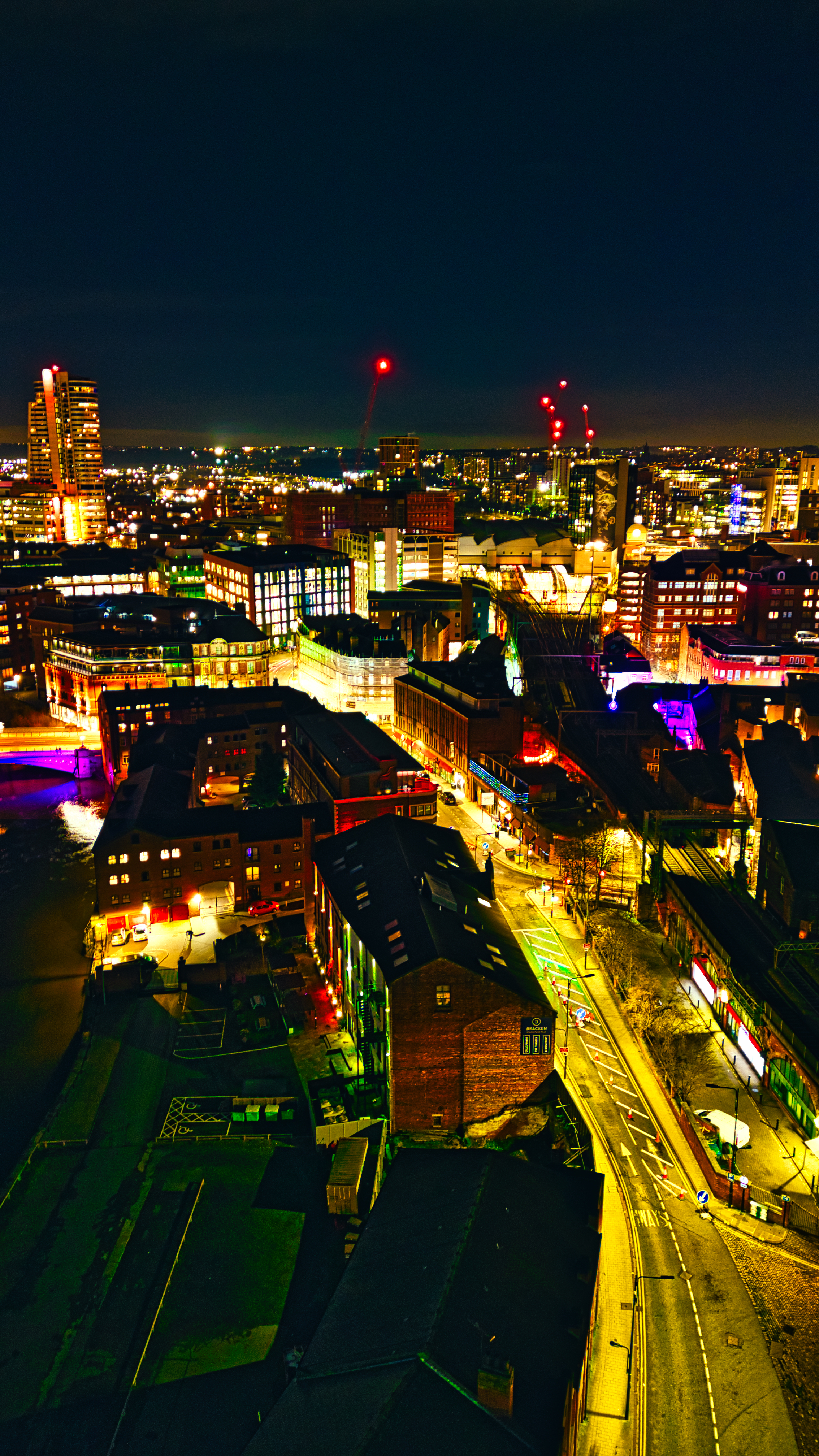 Vertical night cityscape with illuminated buildings and streets, showcasing urban architecture and vibrant nightlife in Leeds, UK.