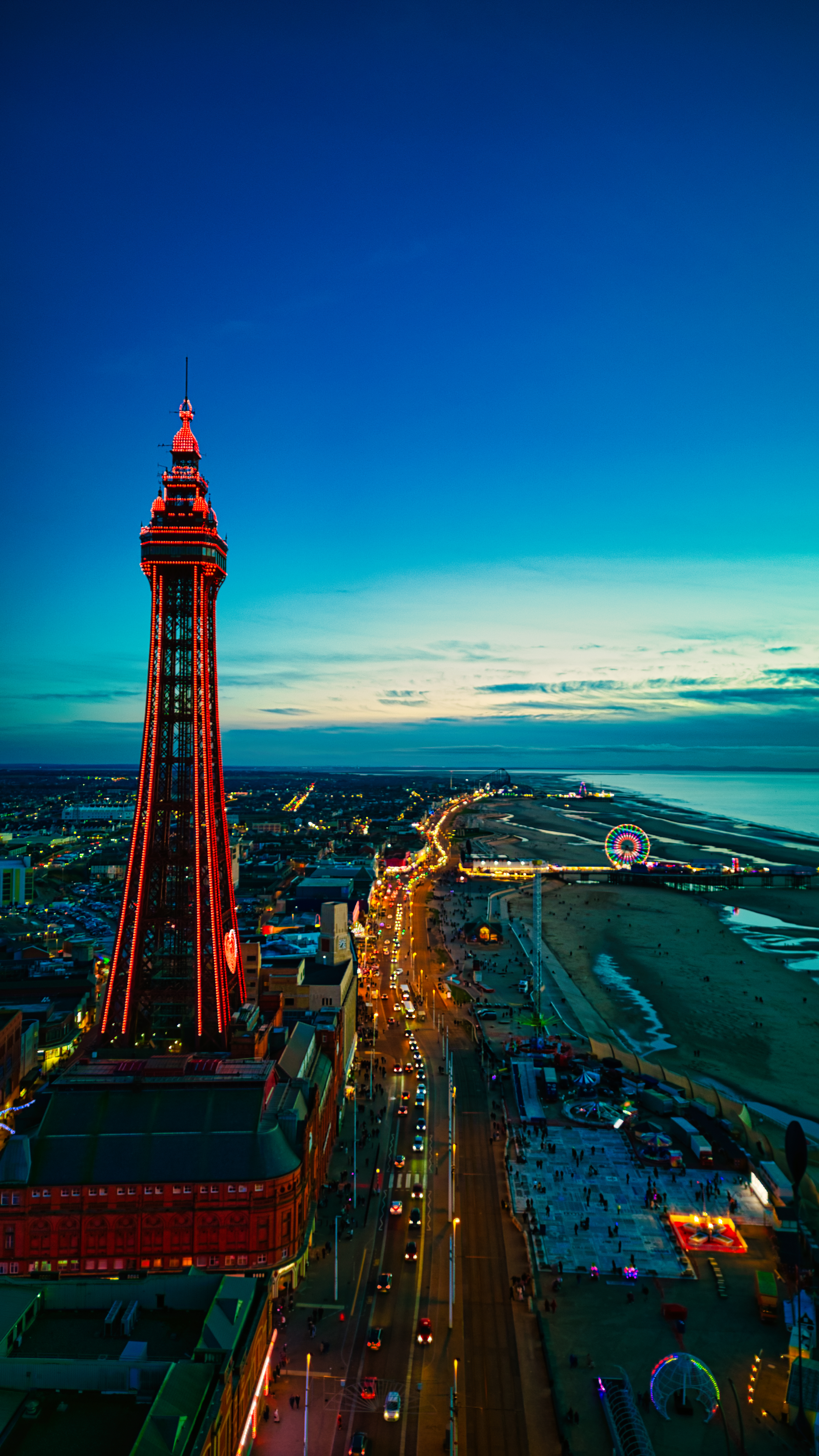 Vertical shot of a lit tower at dusk with a coastal road stretching into the horizon under a blue sky in Backpool, England.