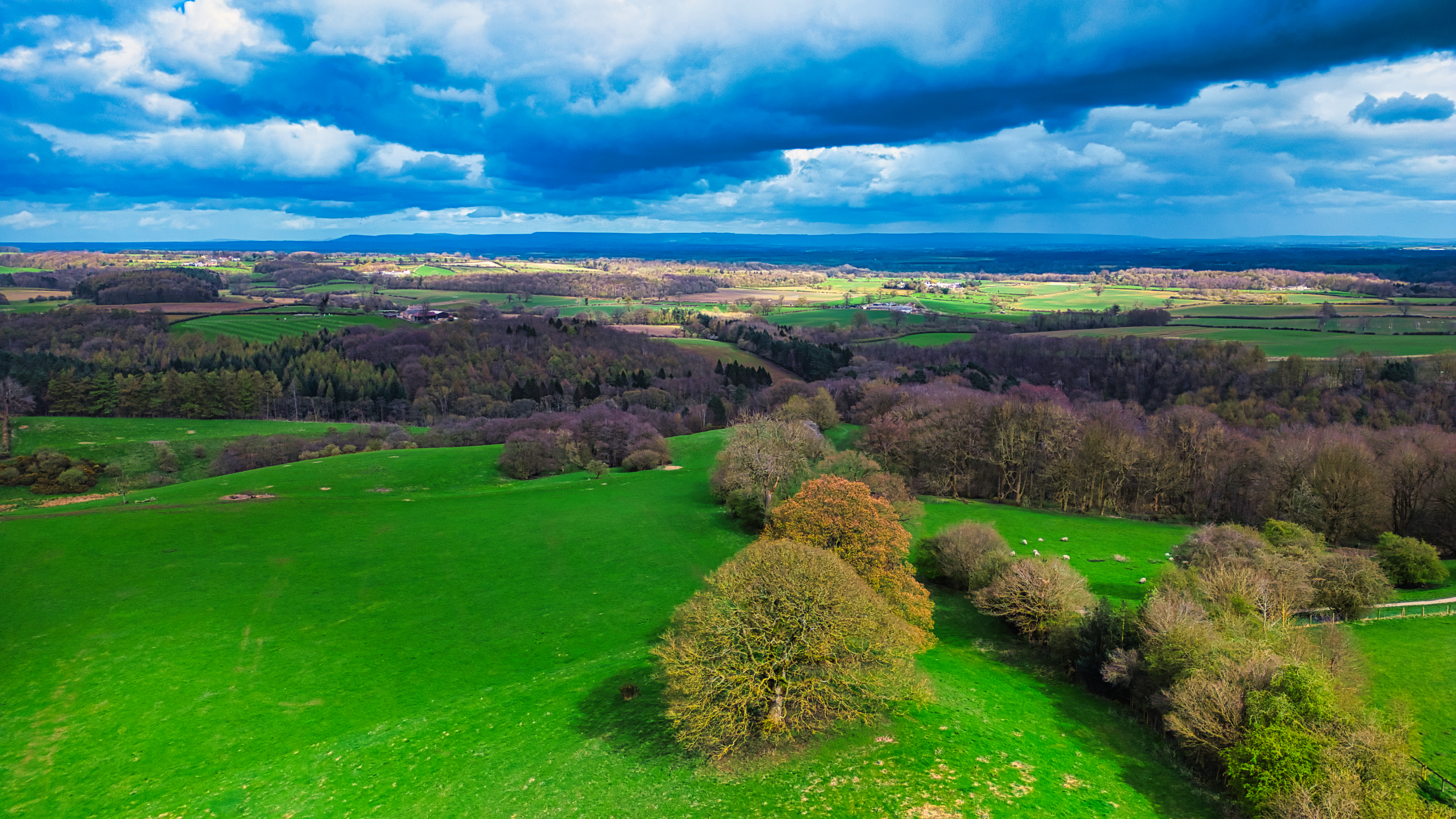 Vibrant aerial landscape with lush green fields, scattered trees, and a dramatic sky with fluffy clouds casting shadows over the countryside.