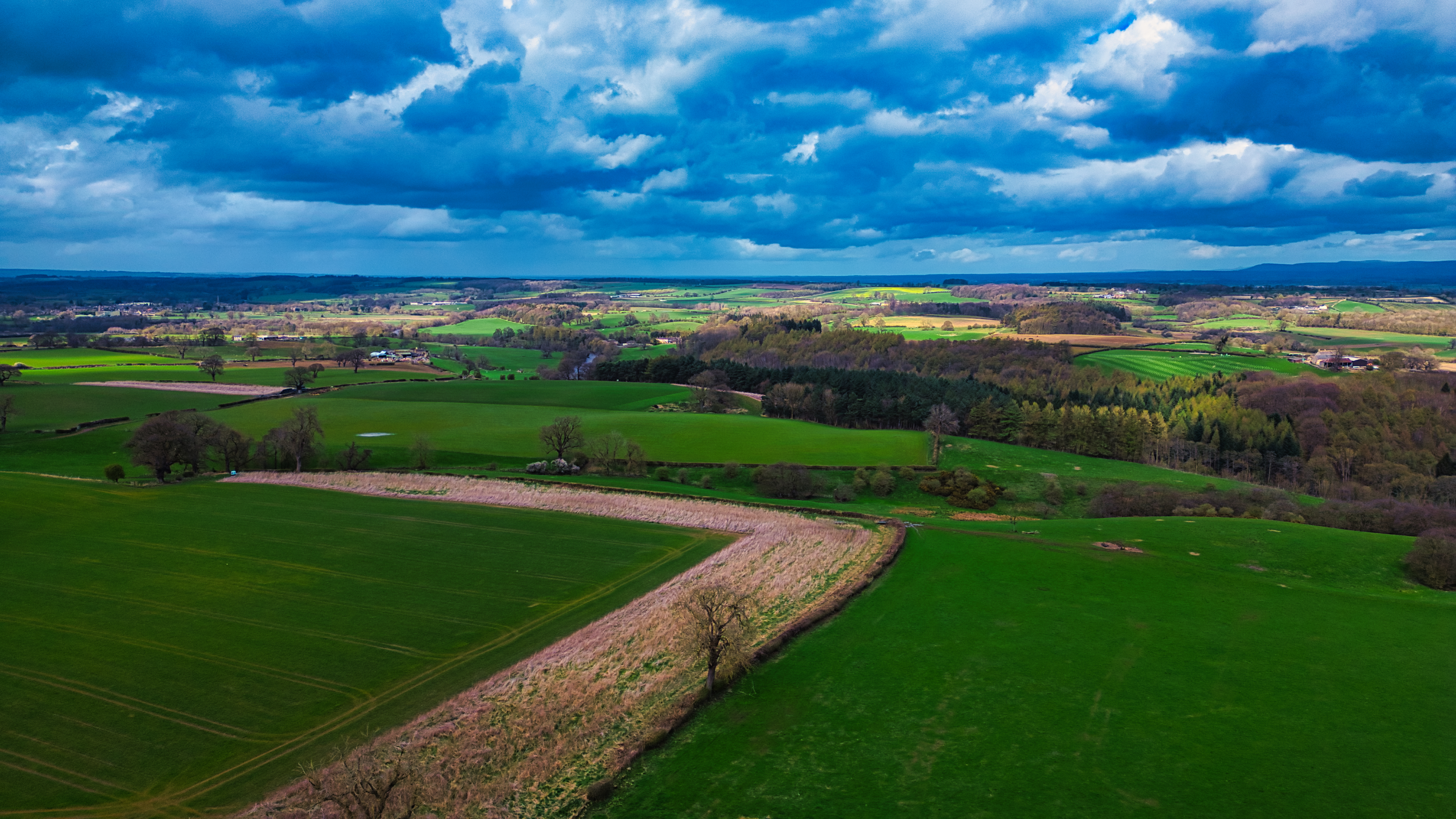 Vibrant aerial view of a lush countryside with patchwork fields under a dramatic sky, showcasing the beauty of rural landscapes and the diversity of agriculture.