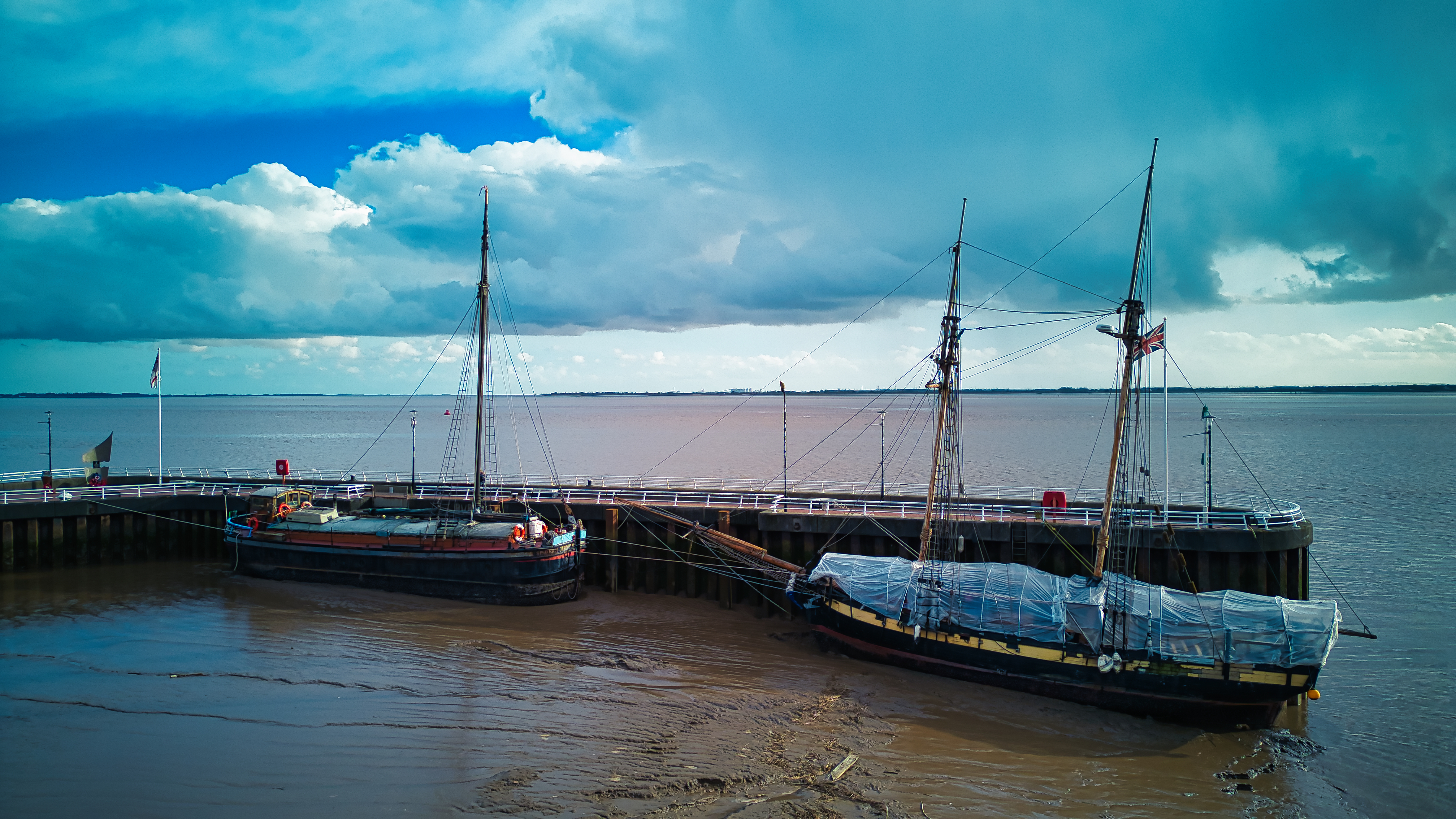 Vintage sailing ships docked at a wooden pier under a cloudy sky, with calm waters and muddy shoreline in Hull, England.